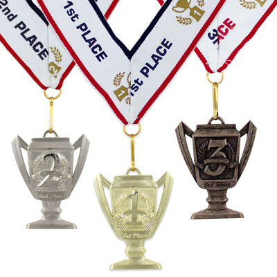 3" X 2" Gold First Place Medal, Silver Second Place Medal, Bronze Third Place Medal. All come with matching 1st, 2nd, 3rd place red, white and blue ribbon. Great medal awards for competitions, tournaments, sporting events, school events, charity events and competitive events. Our medals are a great award to give out to first, second and third place podium finishers. The medals are made from heavy zinc metal, guaranteeing their durability and substantial feel. Unlike cheap plastic imitations, these medals are crafted to be cherished keepsakes