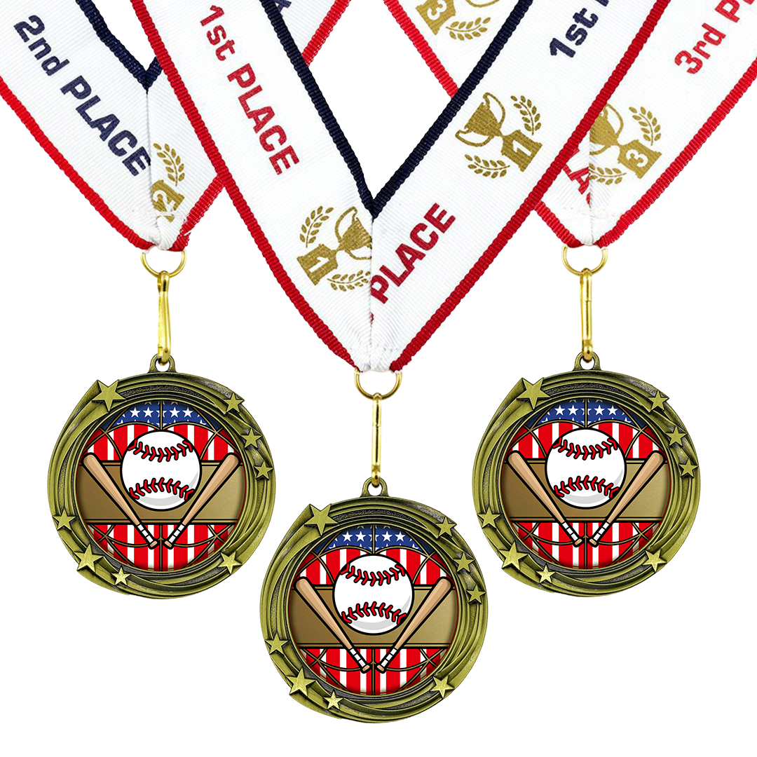 Recognize the remarkable achievements of both Baseball and Softball players with the All Quality Baseball Softball Swirling Stars Design Medal - 1st, 2nd, 3rd Place. This set of three medals is designed to celebrate the outstanding performances of the top three winners in either baseball or softball events.Crafted with meticulous attention to detail, these medals feature a generous antique gold-colored medallion with a striking 2.75-inch diameter, ensuring they stand out and make a lasting impression. The medals are made from heavy zinc metal, guaranteeing their durability and substantial feel. Unlike cheap plastic imitations, these medals are crafted to be cherished keepsakes.The highlight of these medals is the intricate high relief Swirling Stars Design design, adding an elegant and captivating element to their appearance. At the center, you'll find a beautifully designed USA flag baseball/softball, symbolizing the passion and dedication of the players.Each medal comes with a custom red, white, and blue ribbon, perfectly complementing the USA flag baseball/softball design and featuring "1st Place," "2nd Place," or "3rd Place" markings to denote the placement. This adds a patriotic touch and makes it easy to identify the achievements of the recipients.Ideal for baseball and softball tournaments, leagues, or school events, these medals are the perfect way to honor the top performers and commemorate their success. Celebrate the spirit of the game and reward excellence with the All Quality Baseball Softball Swirling Stars Design Medal - 1st, 2nd, 3rd Place.