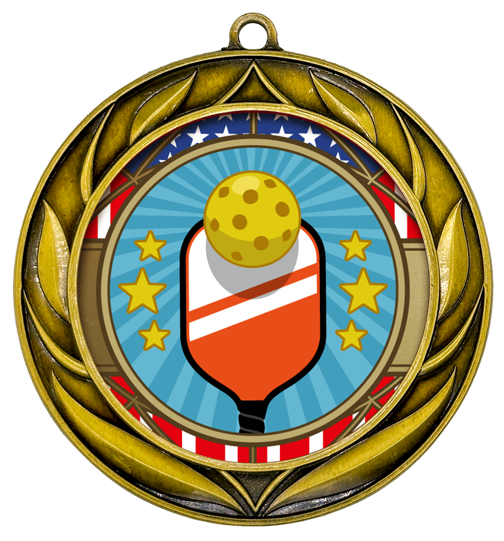 Recognize competitors' achievements with the All Quality Wreath Design Pickleball Medal - 1st, 2nd, 3rd Place. This set of three medals is designed to celebrate the outstanding performances of the top three winners in your events.Crafted with meticulous attention to detail, these medals feature a generous antique gold-colored medallion with a striking 2.75-inch diameter, ensuring they stand out and make a lasting impression. The medals are made from heavy zinc metal, guaranteeing their durability and substantial feel. Unlike cheap plastic imitations, these medals are crafted to be cherished keepsakes.The highlight of these medals is the intricate high relief Wreath design, adding an elegant and captivating element to their appearance. At the center, you'll find a beautiful USA flag design, symbolizing the passion and dedication of recipients. Each medal comes with a custom red, white, and blue ribbon, perfectly complementing the USA flag design and featuring "1st Place," "2nd Place," or "3rd Place" markings to denote the placement.