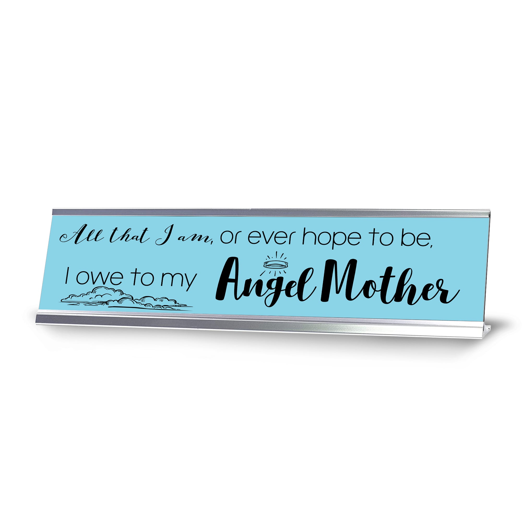 Signs By Lita Novelty Desk Sign Nameplate "All That I Am, Or Ever Hope To Be, I Owe To My Angel Mother". Fun novelty desk sign gift idea for friends, family colleagues, bosses, managers and more. The premium sublimated plastic nameplate comes with a sturdy colored alumium frame. Great office or desk sign for letting your mother know that all that you are, you it owe it to her.