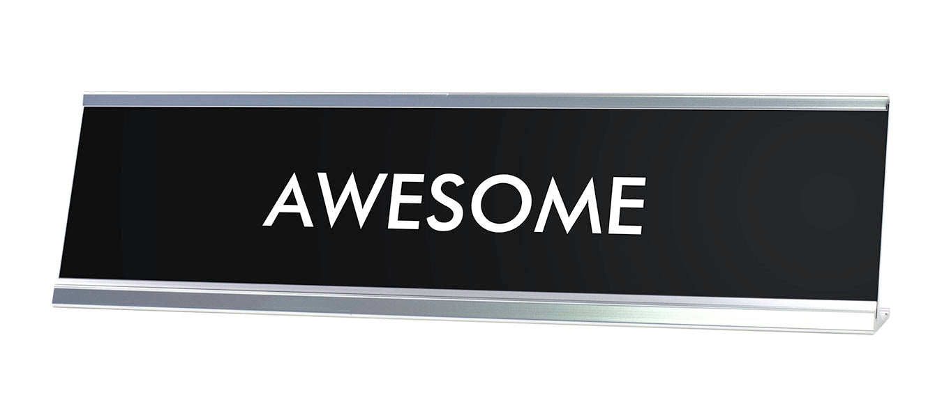 Novelty Desk Plate sign for the at home or work. The name plate is black with white lettering. Plate slides into a silver aluminum desk holder.