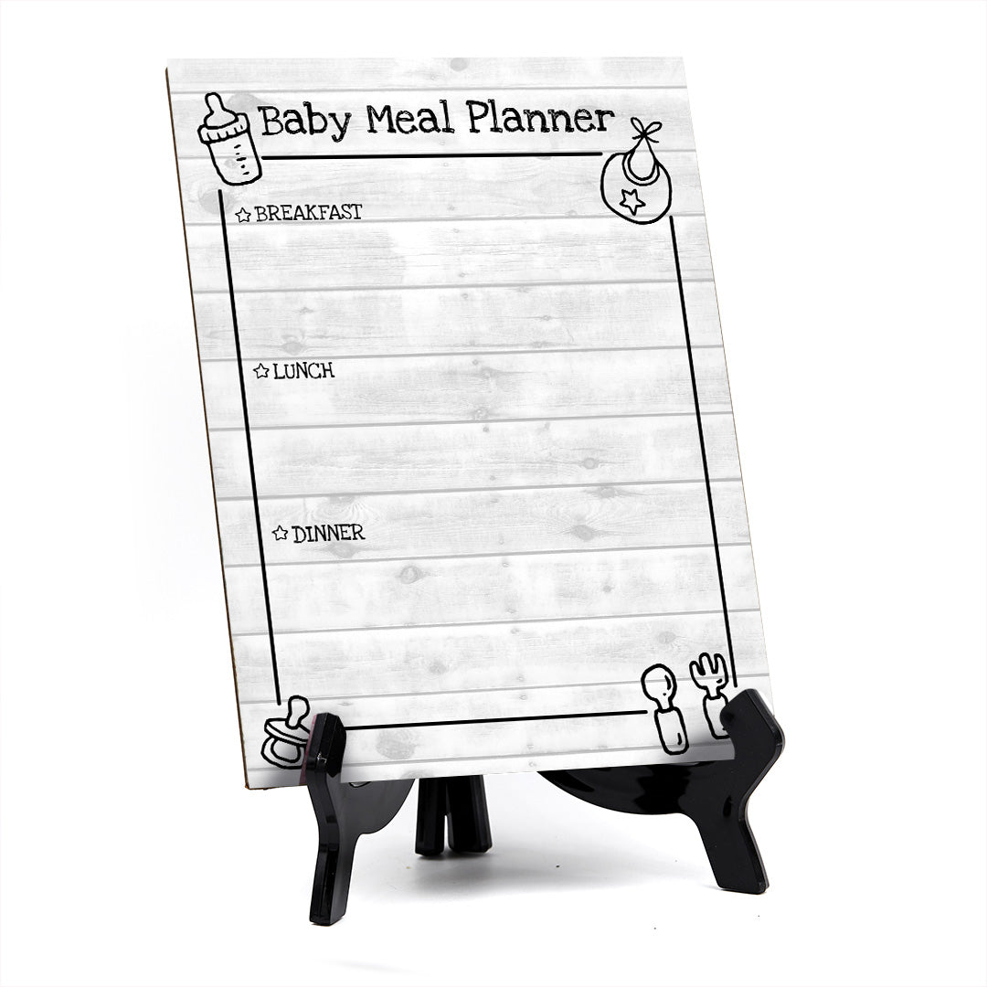 Baby Meal Planner Breakfast, Lunch, Dinner (bullet list), Dry Wipe, Decorative Table Sign. This table sign comes with it's own black acrylic easel, easy to set up and display on any flat surface, eco-friendly signs with easy-to-clean surface.