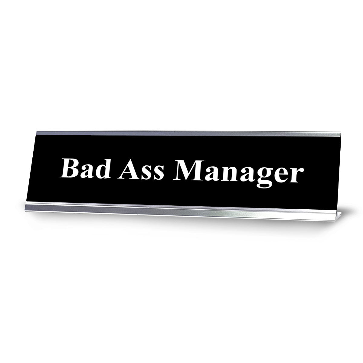 Signs By Lita Designer Desk Sign Nameplate "Bad Ass Manager, Black and White". Funny office gift idea for managers, staff, colleagues, friends and family. Our novelty office desk signs look great on work desks, shelves and counters. Great small gift for your home office or work space.
