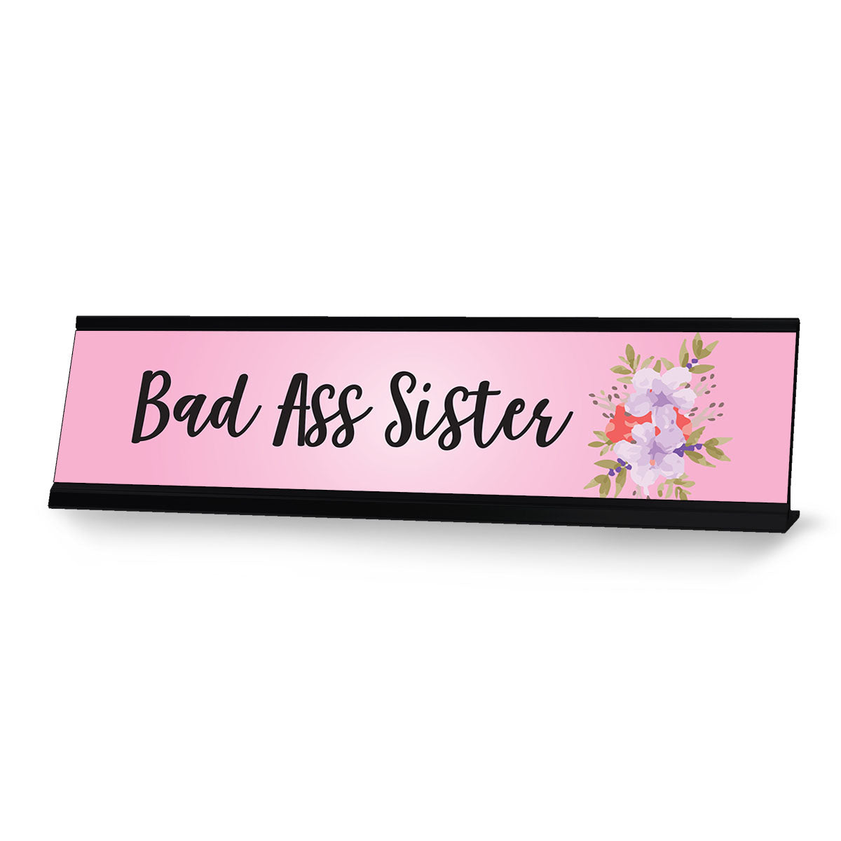Signs By Lita Designer Desk Sign Nameplate "Bad Ass Sister". Beautiful office gift idea for Sister's and friends. Our novelty office desk signs look great on work desks, shelves and counters. Great small gift for your home office or work space.