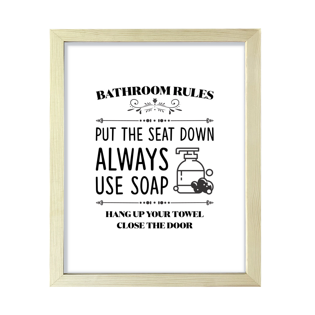 Bathroom Rules Put The Seat Down FRAMED PRINT. Our wall art is available either as a 5" x 7", 8" x 10" or 11" x 14". Printed on 160 GSM high quality card. Comes with a choice of Black, Light Brown or White colored frames. Easy to hang on any wall. This art is great for your home or office bathroom or restroom.