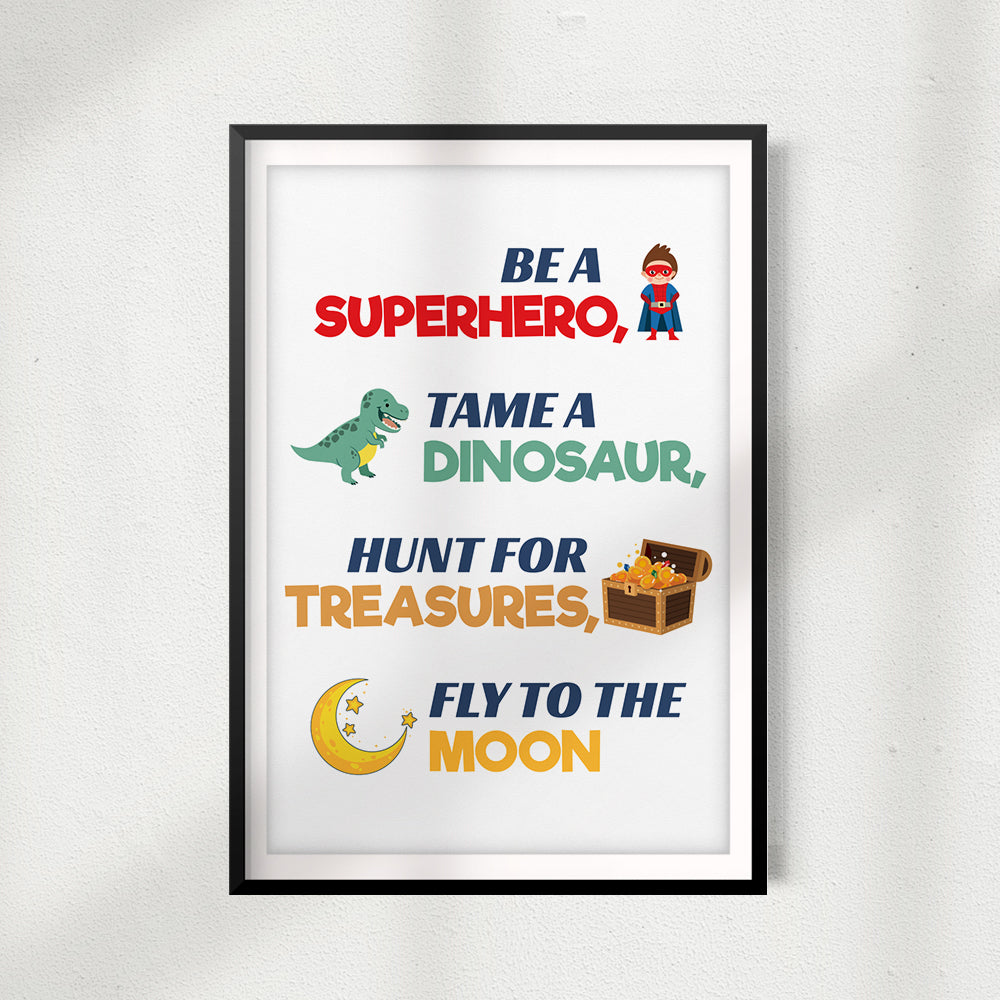 Be A Superhero, Tame A Dinosaur, Hunt For Treasures, Fly To The Moon UNFRAMED Print Décor Wall Art