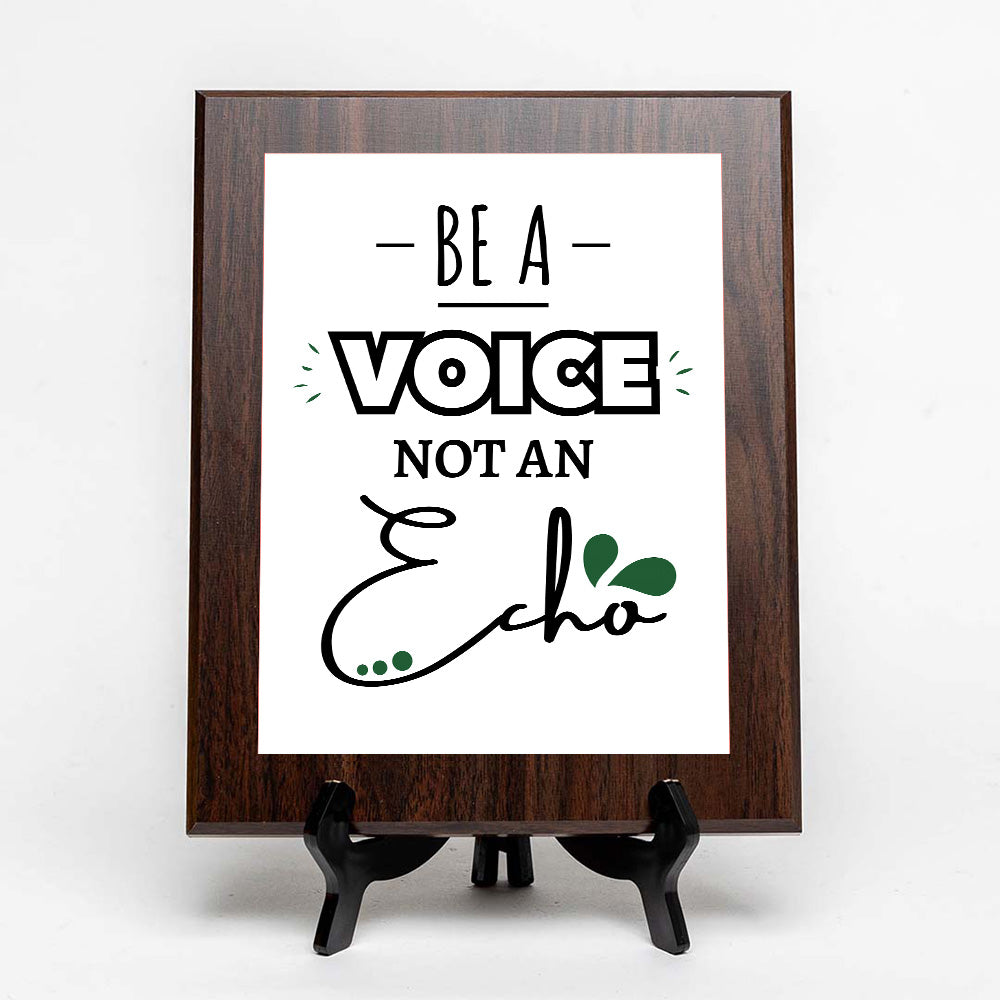 Elevate your space with our Be A Voice Not An Echo decorative wall plaque. Crafted with precision, each plaque features a solid Walnut finish wood base with a sleek aluminum plate, carrying a range of stylish and contemporary designs. Choose from three sizes - 7x5", 10x8", or 9x12" - and a stylish natural or black wood base. For easy installation, each plaque is equipped with pre-cut keyhole slots on the reverse side. Mount it securely on your wall or display it on a stylish acrylic easel for added versatility. Our commitment to quality extends to ensuring your plaque arrives in pristine condition. Each piece is carefully shrink-wrapped and protected with bubble wrap during transit, so you receive it exactly as envisioned. Transform your surroundings and make a lasting impression with these beautifully crafted pieces. It's more than decor; it's a reflection of your taste and a tribute to enduring elegance.