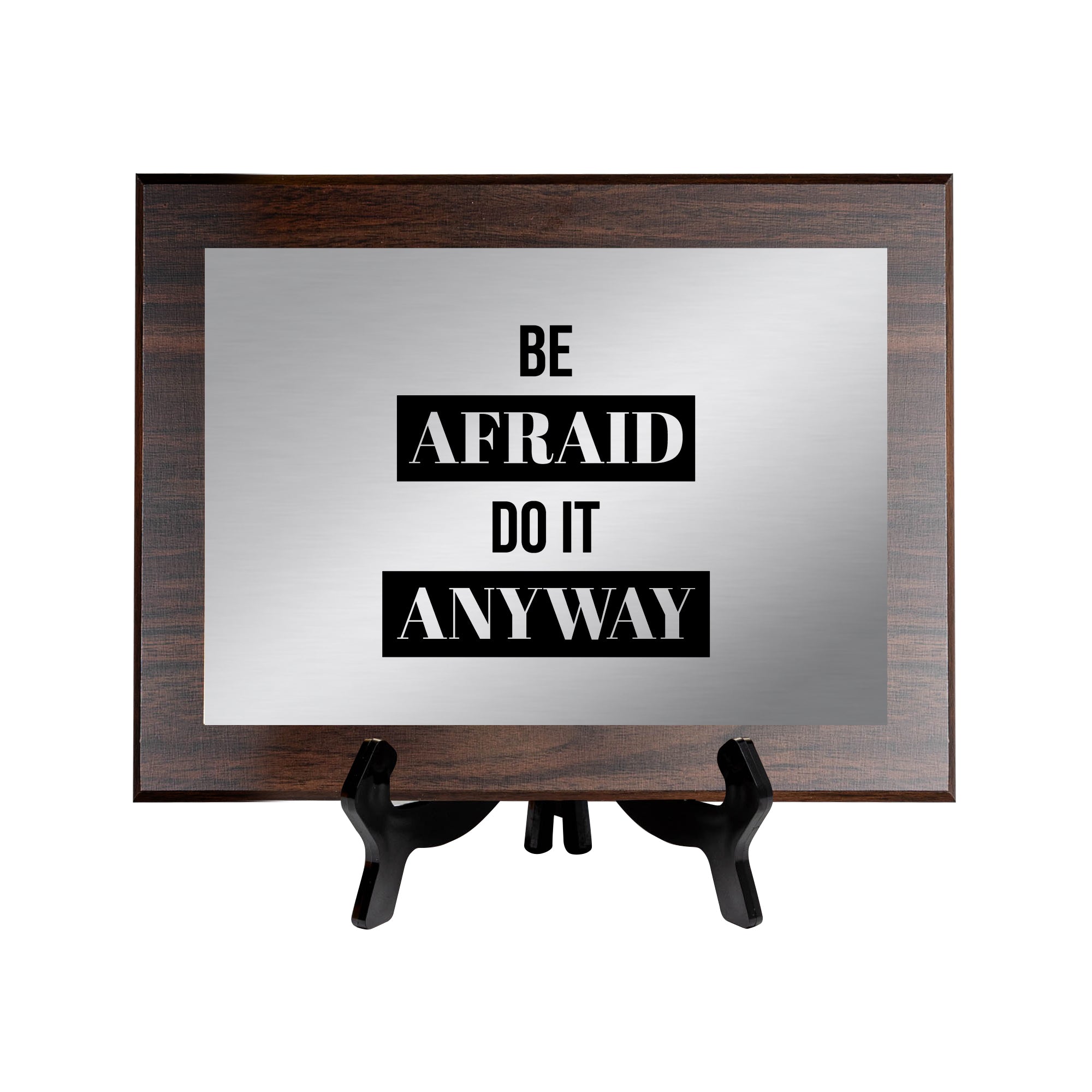 Elevate your space with our Be Afraid and Do It Anyway decorative wall plaque. Crafted with precision, each plaque features a solid Walnut finish wood base with a sleek aluminum plate, carrying a range of stylish and contemporary designs. Choose from three sizes - 7x5", 10x8", or 9x12" - and a stylish natural or black wood base. For easy installation, each plaque is equipped with pre-cut keyhole slots on the reverse side. Mount it securely on your wall or display it on a stylish acrylic easel for added versatility. Our commitment to quality extends to ensuring your plaque arrives in pristine condition. Each piece is carefully shrink-wrapped and protected with bubble wrap during transit, so you receive it exactly as envisioned. Transform your surroundings and make a lasting impression with these beautifully crafted pieces. It's more than decor; it's a reflection of your taste and a tribute to enduring elegance.