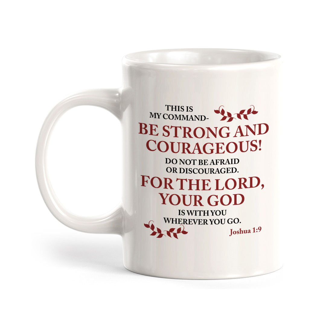 "Be Strong And Courageous... For The Lord, Your God Is With You Wherever You Go" - Joshua 1:9, Coffee Mug. Treat yourself or give as a gift to someone special. Our Bible Verse coffee mugs are great small gifts for loved ones, colleagues, partners and friends. Inspirational, Bible verse coffee mug. Great small gift idea for your home or office kitchen space.