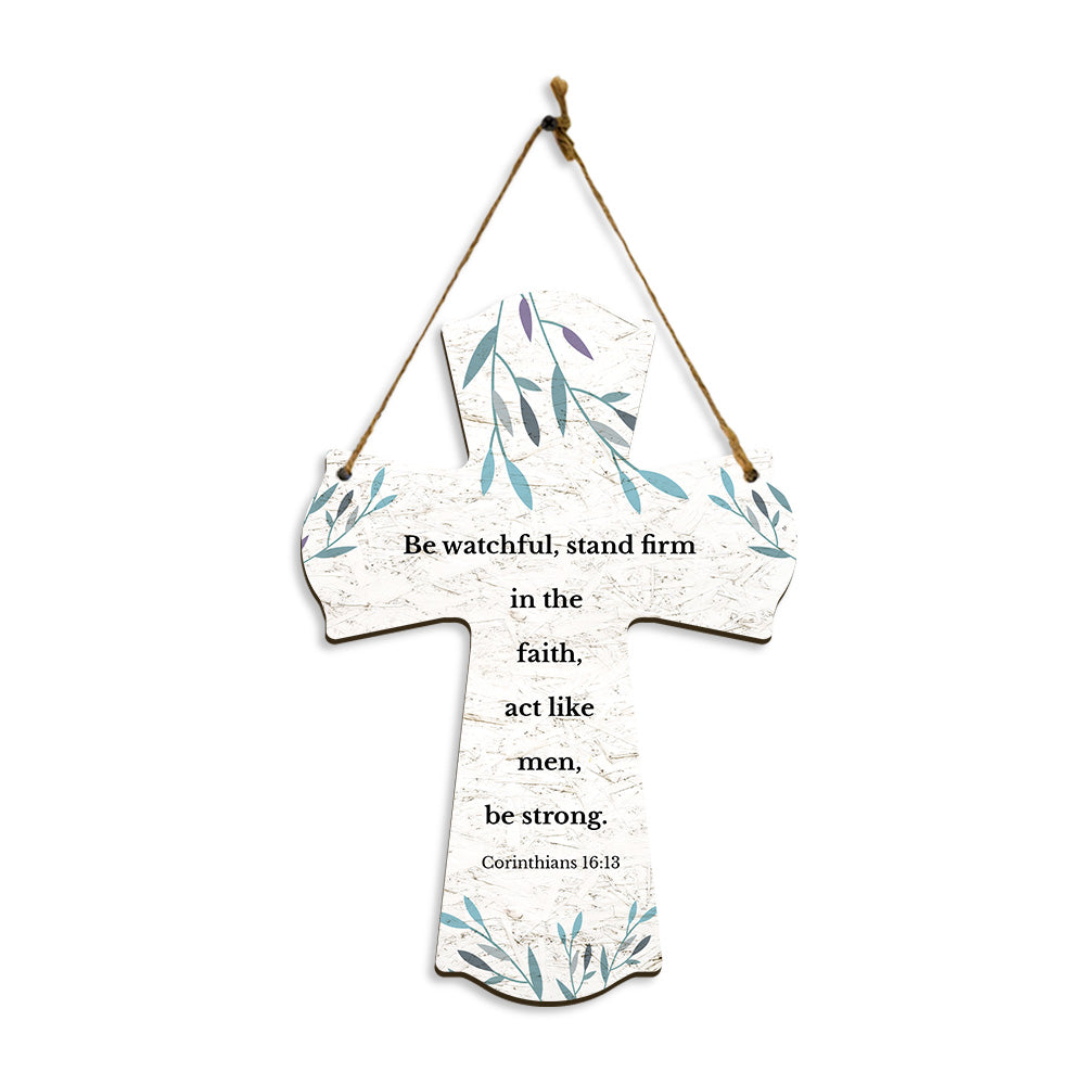 Be watchful, stand firm in the faith, act like men, be strong. Corinthians 16:13 11.5" x 8" Cross Hanging Sign | Rustic Twine | Inspiring Religious Bible Decor