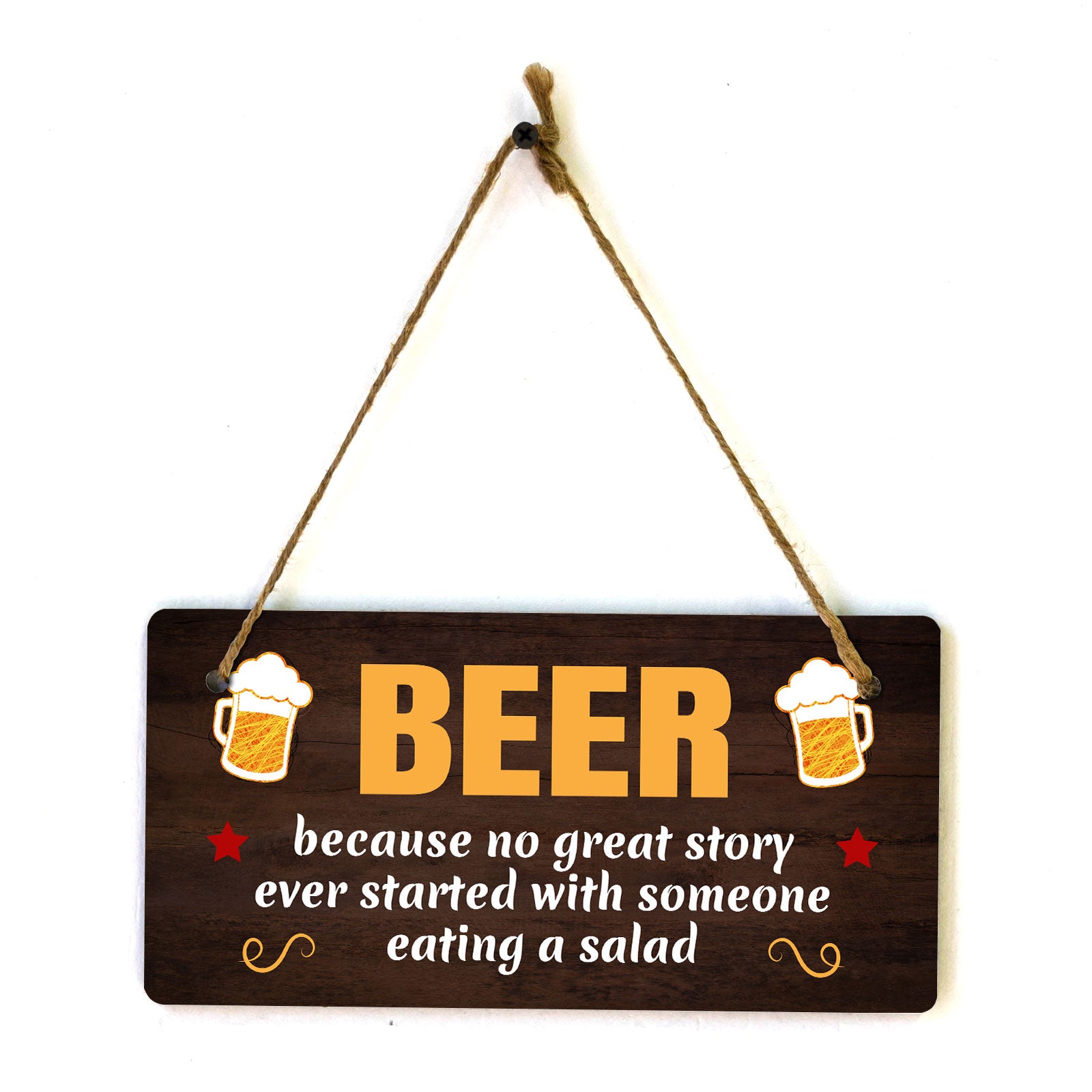 Introducing our versatile and stylish Beer Because No Great Story Ever Started With Someone Eating A Salad, the perfect blend of style and sophistication to elevate your home or workplace. Our 5x10 Hanging Sign range is the perfect choice for your home, workplace or business. Each sign is attached with rustic twine, providing a charming and versatile accent for any space. Our curated designs effortlessly complement a variety of styles, from rustic farmhouse or Modern Chic, to simple and functional options. Choose from our diverse range of designs to personalize your space. Whether it's a warm welcome at the entrance, a motivational quote for your workspace, or a playful touch for the kids' room, our Hanging Wall or Door Signs are the perfect way to express your unique style.
