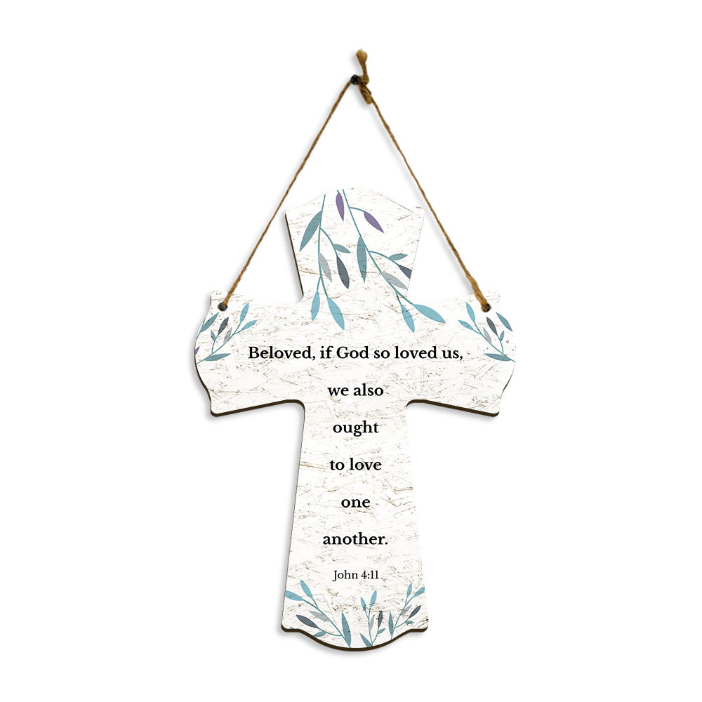 Beloved, if God so loved us, we also ought to love one another. John 4:11 11.5" x 8" Cross Hanging Sign | Rustic Twine | Inspiring Religious Bible Decor