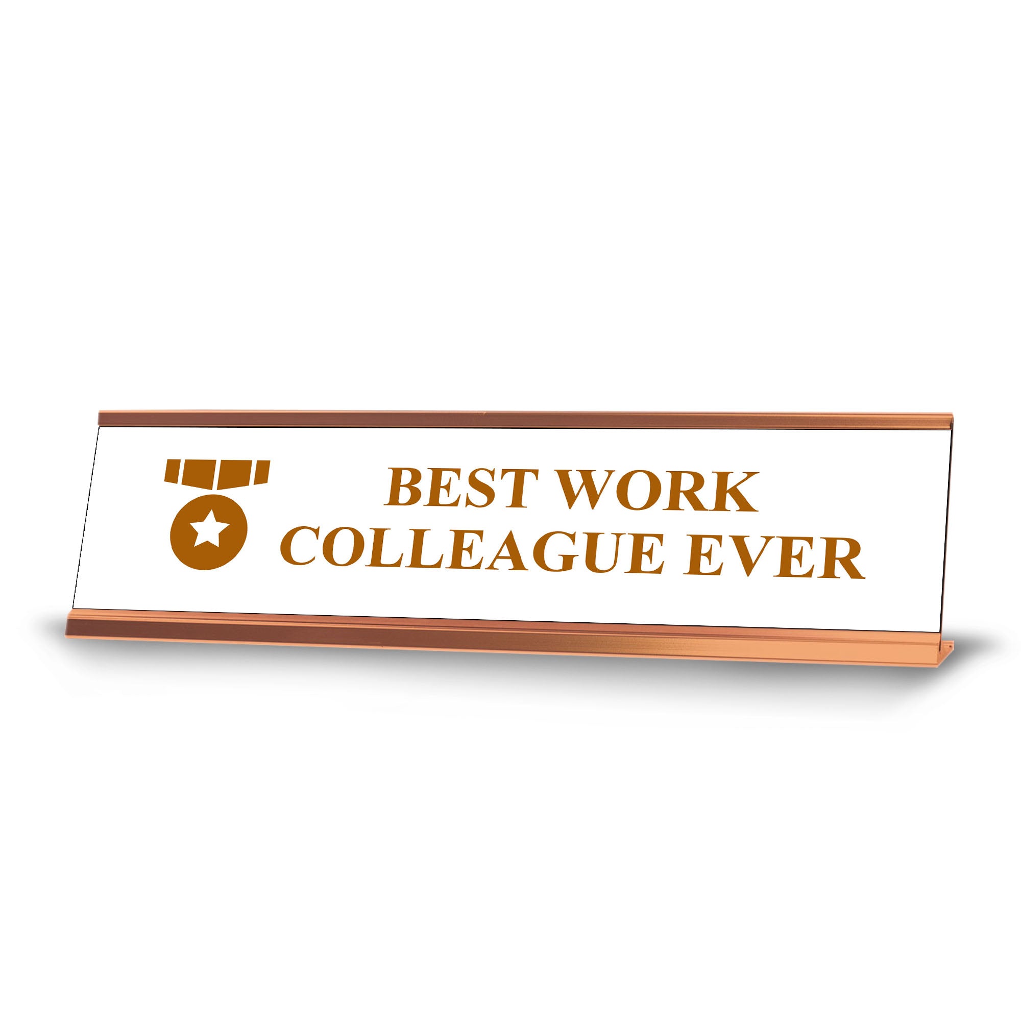 Signs By Lita Novelty Desk Sign Nameplate "Best Work Colleague Ever, Gold Frame". Fun novelty desk sign gift idea for friends, family colleagues, bosses, managers and more. The premium sublimated plastic nameplate comes with a sturdy colored alumium frame. Easily change out your nameplate with other 2 x 8" signs.