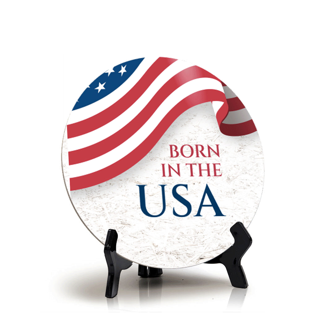 Born in the USA (5 x 5“) Circle Table Sign with Acrylic Stand | American Pride Decoration