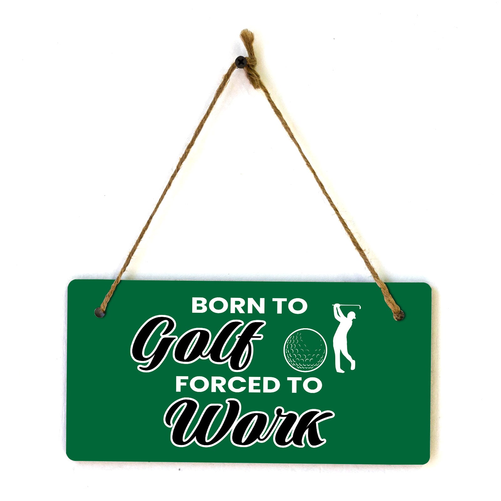 Introducing our versatile and stylish Born To Golf Forced To Work, the perfect blend of style and sophistication to elevate your home or workplace. Our 5x10 Hanging Sign range is the perfect choice for your home, workplace or business. Each sign is attached with rustic twine, providing a charming and versatile accent for any space. Our curated designs effortlessly complement a variety of styles, from rustic farmhouse or Modern Chic, to simple and functional options. Choose from our diverse range of designs to personalize your space. Whether it's a warm welcome at the entrance, a motivational quote for your workspace, or a playful touch for the kids' room, our Hanging Wall or Door Signs are the perfect way to express your unique style.