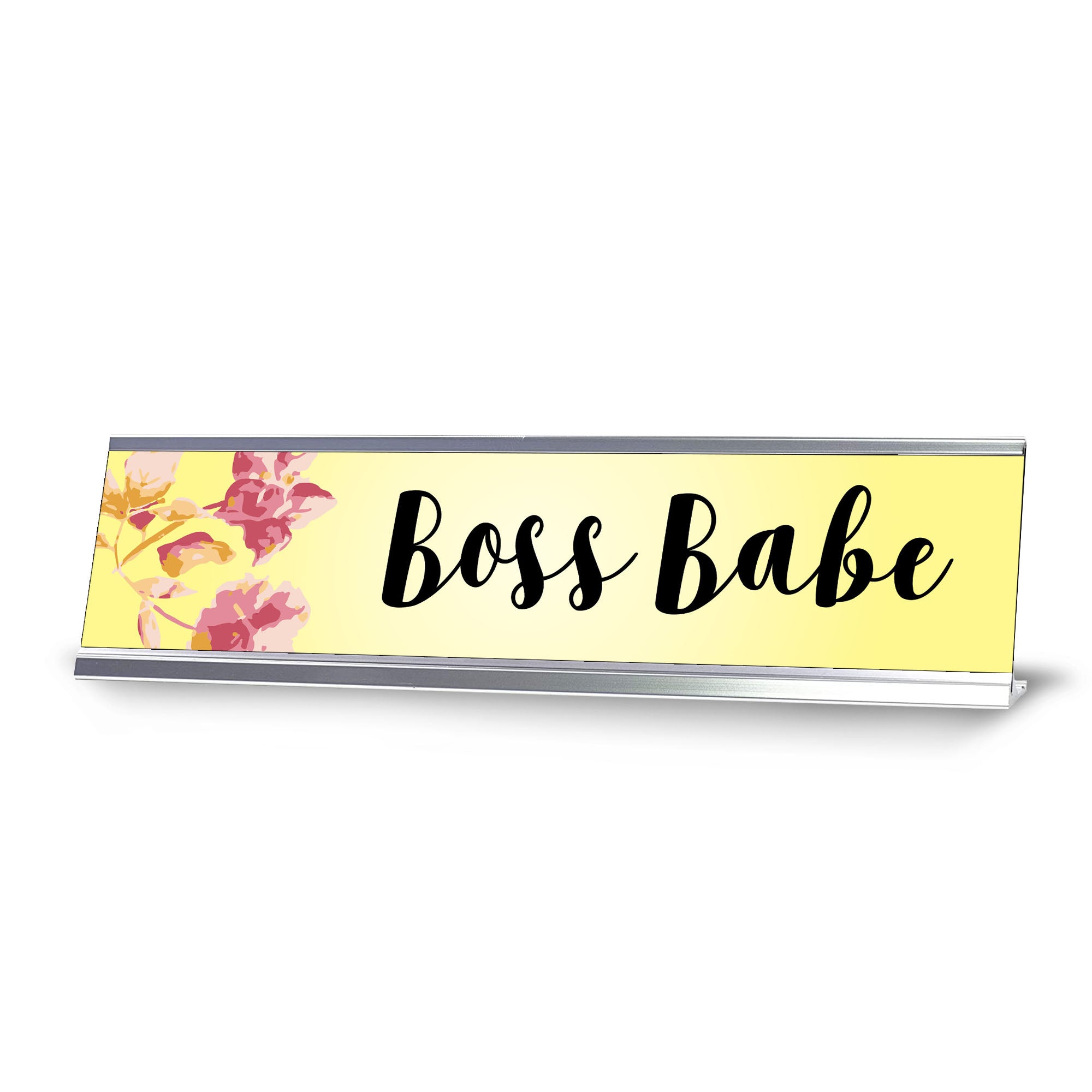 Signs ByLITA Novelty Desk Sign Nameplate "Boss Babe, Yellow Floral". Fun novelty desk sign gift idea for friends, family colleagues, bosses, managers and more. The premium sublimated plastic nameplate comes with a sturdy colored alumium frame.