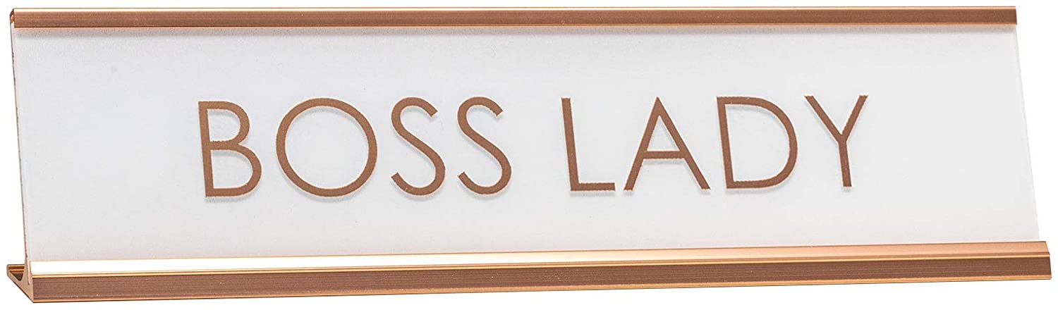 Boss Lady Desk Sign for the at home or work. The name plate has white background with rose gold foil wording. Plate slides into a rose gold Desk Plate holder.