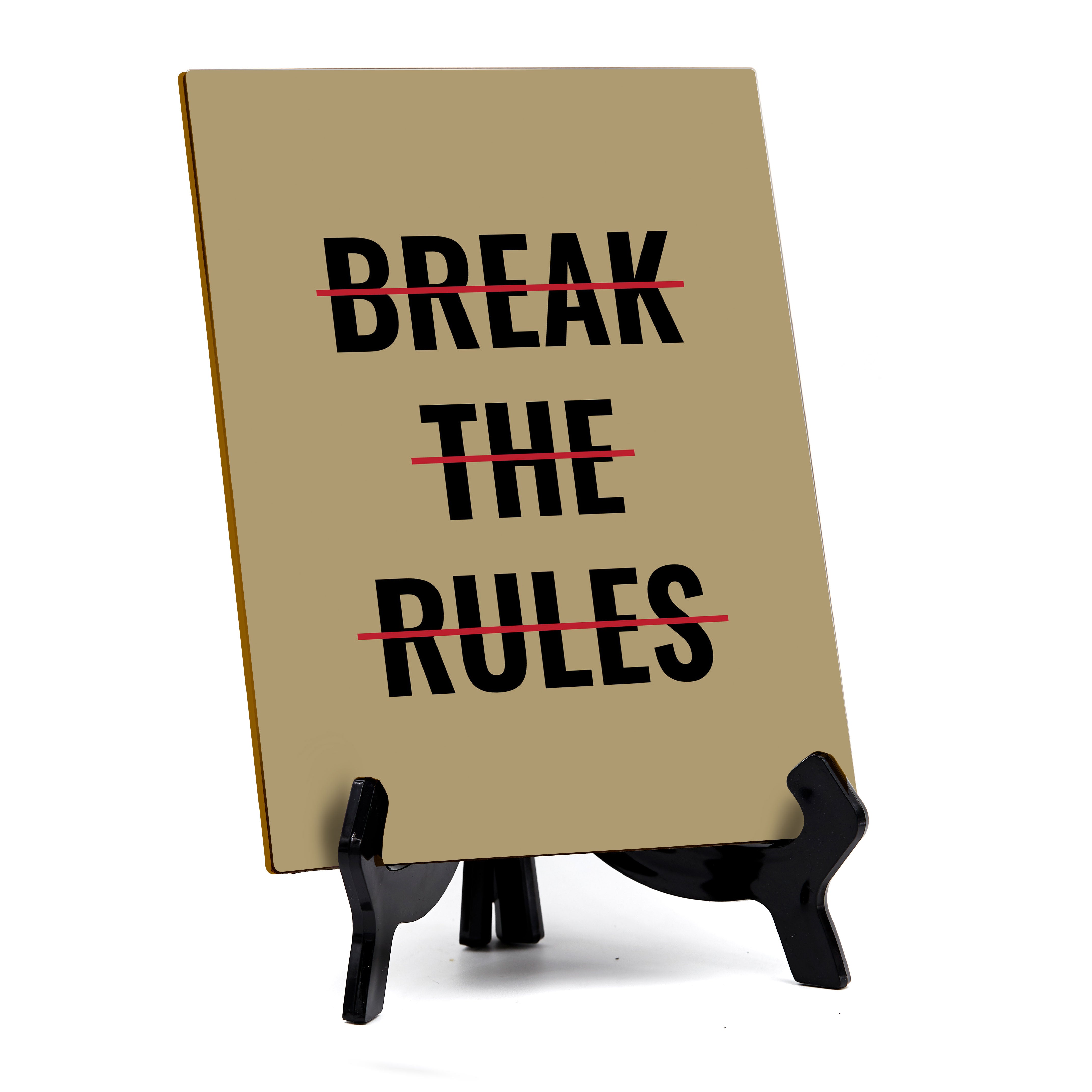 Break The Rules, 6X8 Table Sign. This table sign comes with it's own black acrylic easel, easy to set up and display on any flat surface. Elevate the ambiance of any space with our Motivational Table Sign, designed to inspire and uplift with its powerful messages. Measuring 6 x 8 inches, this sleek and stylish sign is the perfect addition to your desk, table, or shelf. Crafted from premium materials, it boasts durability and longevity, ensuring that its motivational quotes continue to inspire for years to come. Featuring an elegant black easel stand, this sign effortlessly blends in with any decor, adding a touch of sophistication to your surroundings. Whether placed in your home, office, classroom, or any other environment, its versatility shines through, offering a source of inspiration wherever it's needed. Setting up your motivational sign is a breeze thanks to the included easel stand, allowing for quick and easy display. Whether you're seeking a daily dose of encouragement for yourself or looking for the perfect gift for a friend, family member, or coworker, our Motivational Table Sign is sure to leave a lasting impression. Let positivity and motivation fill your space with this inspiring addition to your decor.
