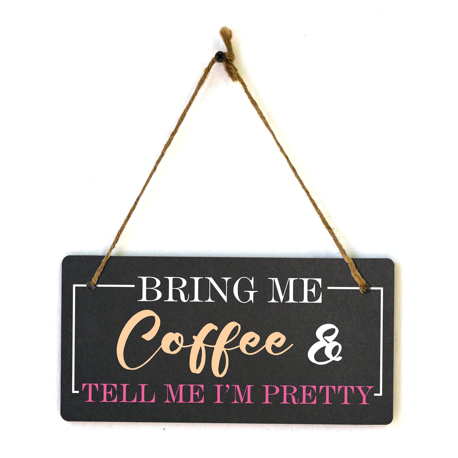 Introducing our versatile and stylish Bring Me Coffee And Tell Me I'm Pretty, the perfect blend of style and sophistication to elevate your home or workplace. Our 5x10 Hanging Sign range is the perfect choice for your home, workplace or business. Each sign is attached with rustic twine, providing a charming and versatile accent for any space. Our curated designs effortlessly complement a variety of styles, from rustic farmhouse or Modern Chic, to simple and functional options. Choose from our diverse range of designs to personalize your space. Whether it's a warm welcome at the entrance, a motivational quote for your workspace, or a playful touch for the kids' room, our Hanging Wall or Door Signs are the perfect way to express your unique style.