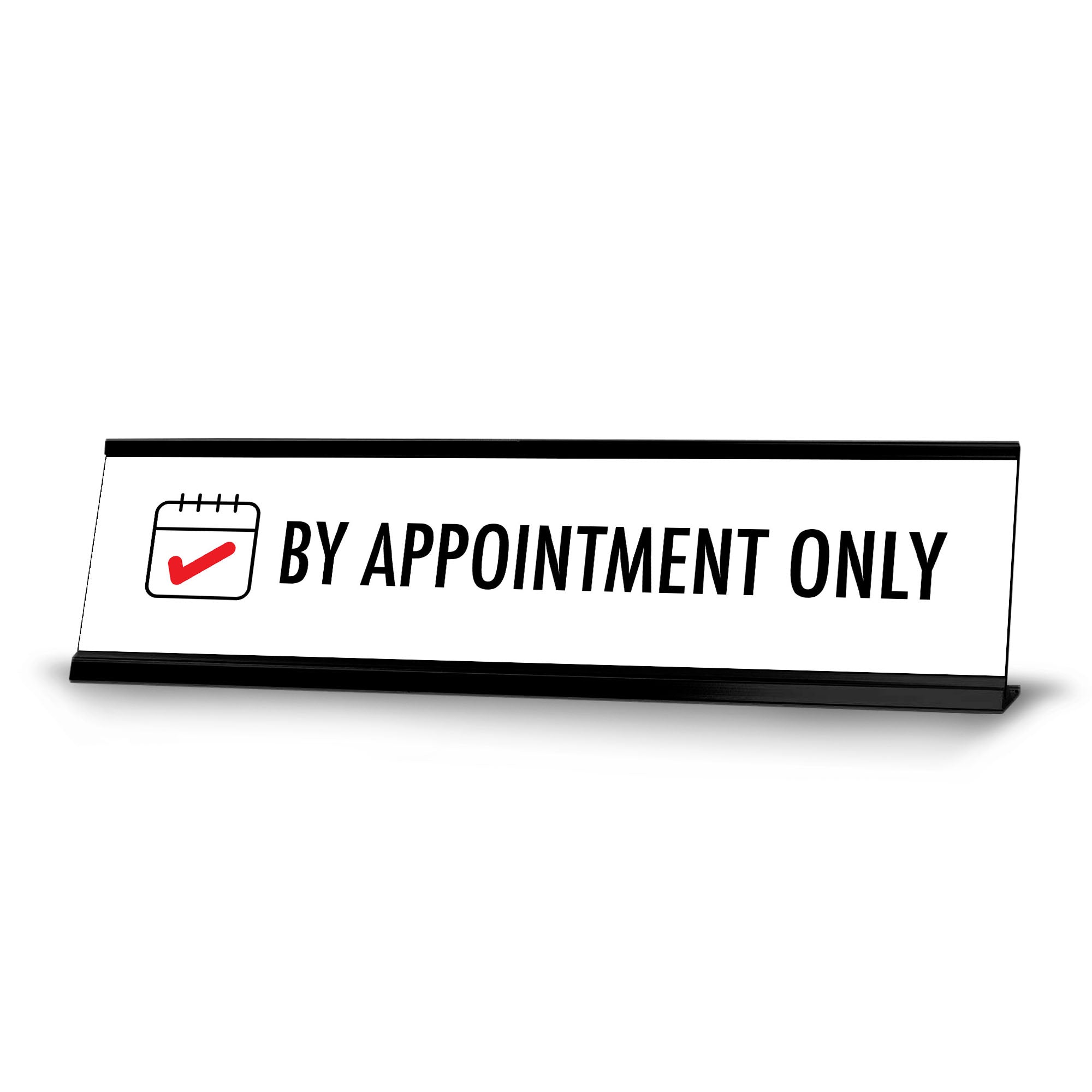 Desk Sign Nameplate "By Appointment Only". Fun novelty desk sign gift idea for friends, family colleagues, bosses, managers and more. The premium sublimated plastic nameplate comes with a sturdy colored alumium frame. Easily change out your nameplate with other 2 x 8" signs. Great office or desk sign for letting customers and staff know that meetings are by appointment only.