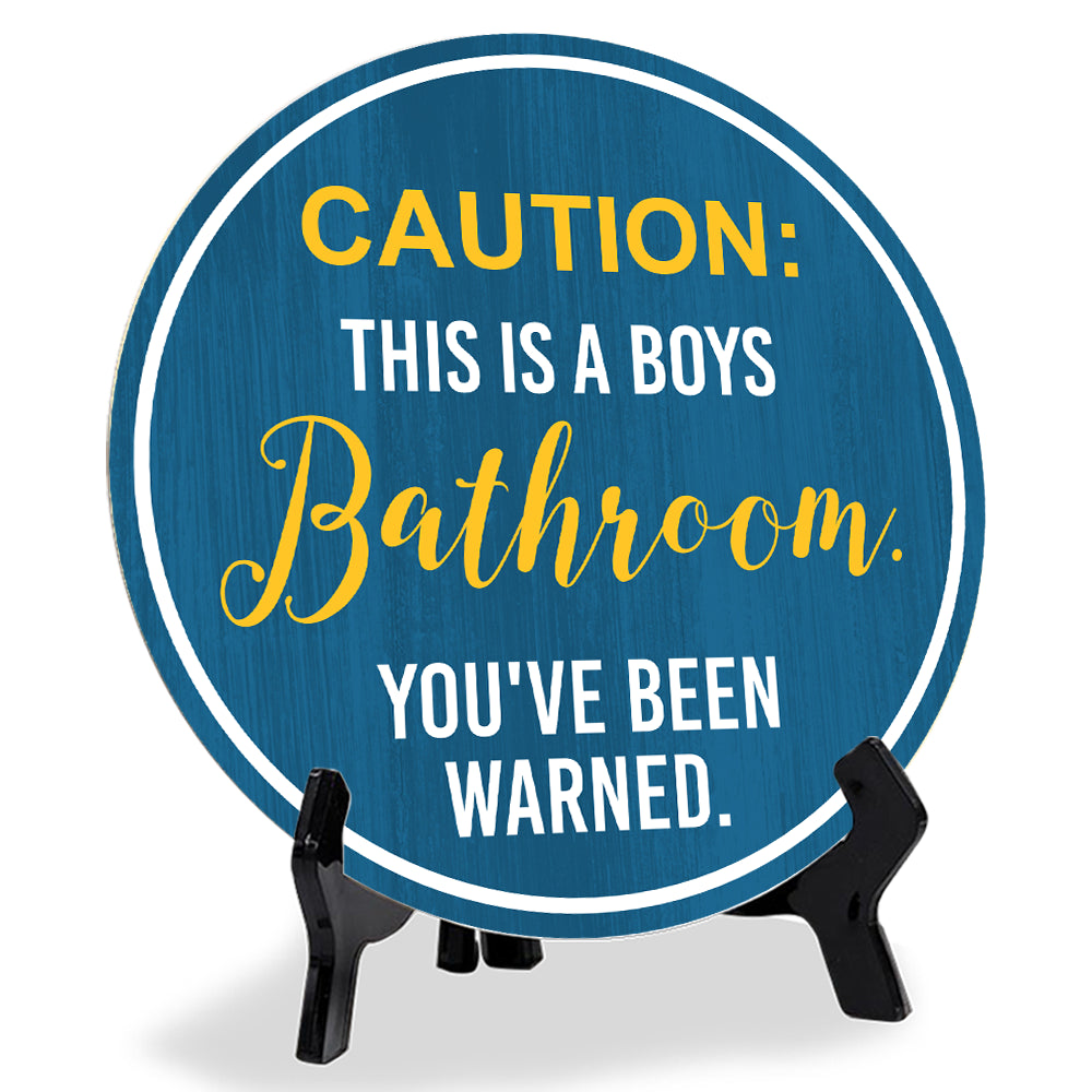 Caution: This Is A Boys Bathroom. You've Been Warned. (5 x 5“) Circle Table Sign with Acrylic Stand | Funny Home Decor