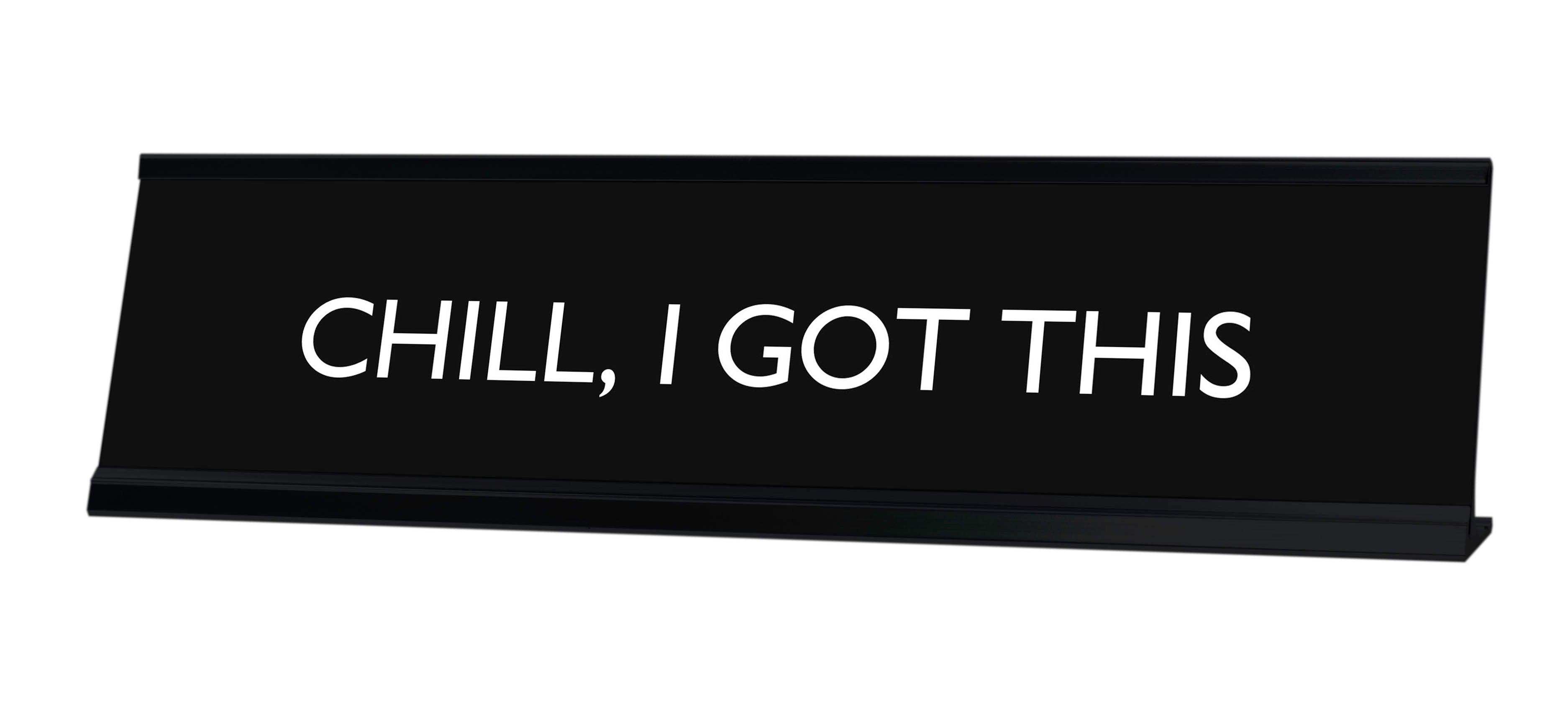 Novelty Desk Plate sign for the at home or work. The name plate is black with white lettering. Plate slides into a silver aluminum desk holder.