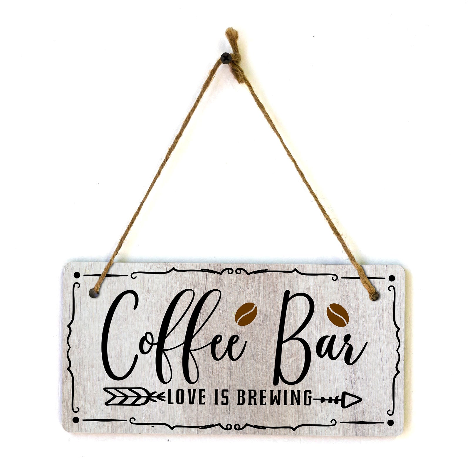Introducing our versatile and stylish Coffee Bar Love Is Brewing, the perfect blend of style and sophistication to elevate your home or workplace. Our 5x10 Hanging Sign range is the perfect choice for your home, workplace or business. Each sign is attached with rustic twine, providing a charming and versatile accent for any space. Our curated designs effortlessly complement a variety of styles, from rustic farmhouse or Modern Chic, to simple and functional options. Choose from our diverse range of designs to personalize your space. Whether it's a warm welcome at the entrance, a motivational quote for your workspace, or a playful touch for the kids' room, our Hanging Wall or Door Signs are the perfect way to express your unique style.
