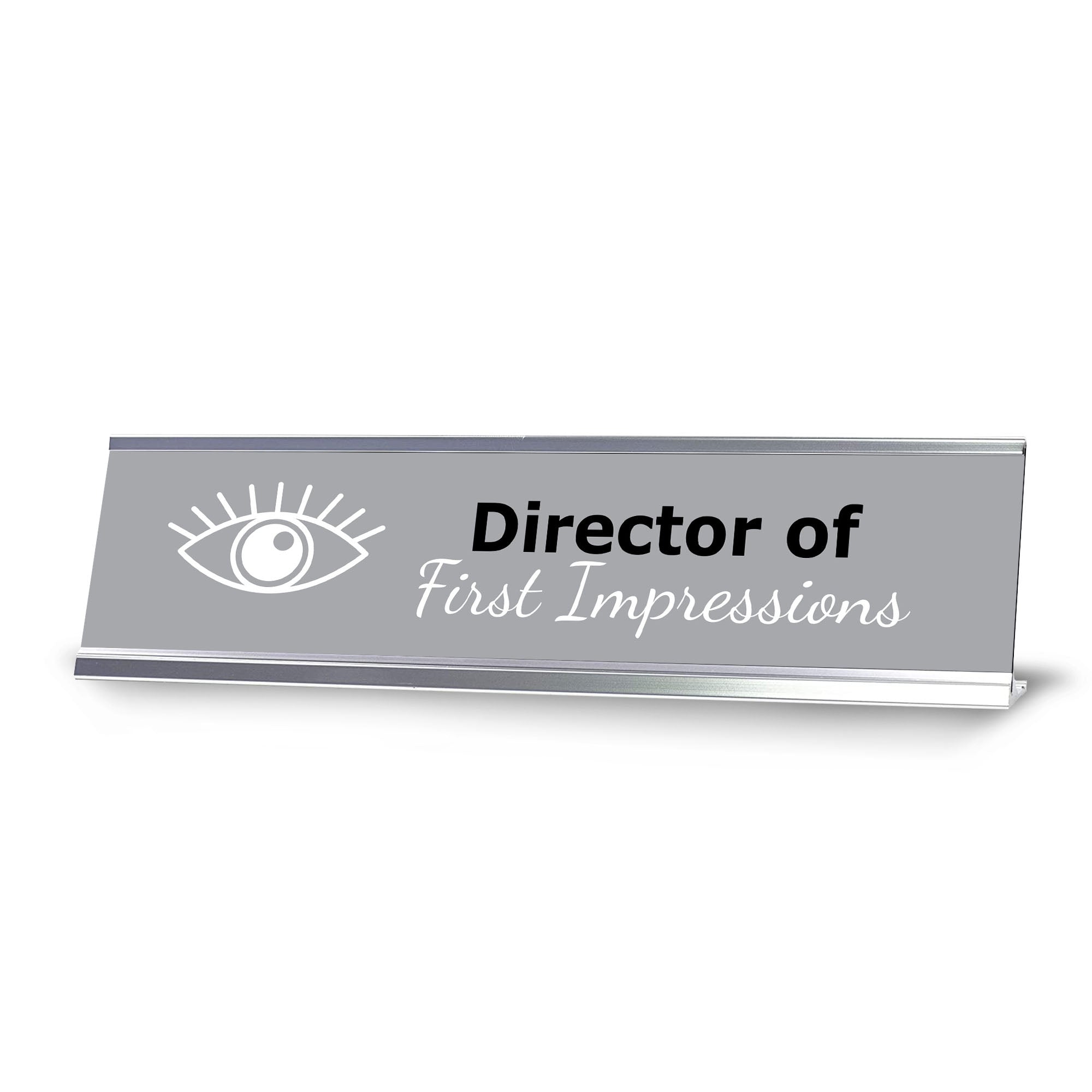 Signs ByLITA Novelty Desk Sign Nameplate "Director of First Impressions". Fun novelty desk sign gift idea for friends, family colleagues, bosses, managers and more. The premium sublimated plastic nameplate comes with a sturdy colored aluminium frame. Great office or desk sign for letting them know the director of first impressions.