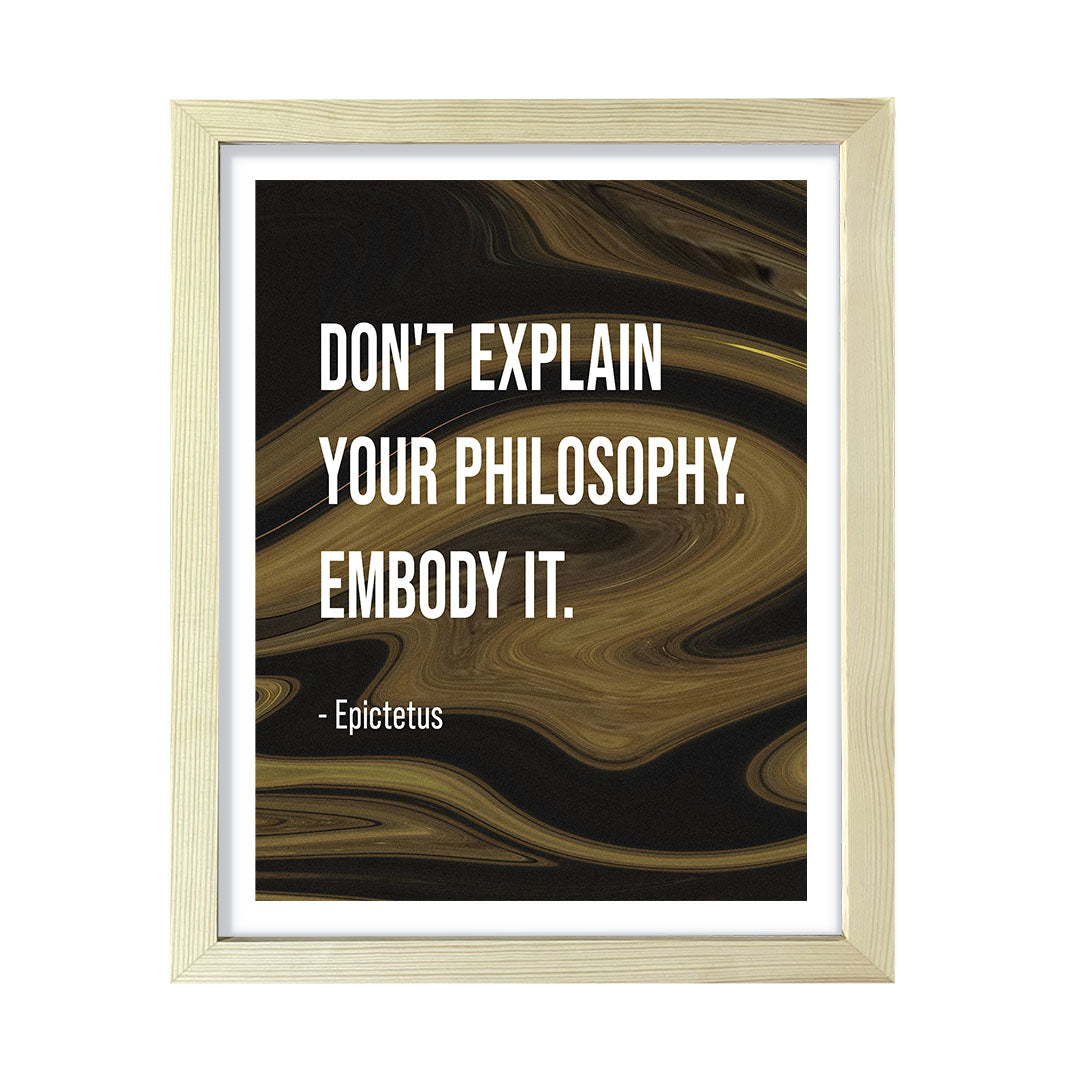 Don't explain your philosophy. Embody it - Epictetus, FRAMED Print. Our wall art is available either as a 5" x 7", 8" x 10" or 11" x 14". Printed on 160 GSM high quality card. Comes as an FRAMED print. Easy to hang on any wall. This art is great for your home and office decor, and bedroom motivational decoration wall art. Be sure to check out our other designs!
