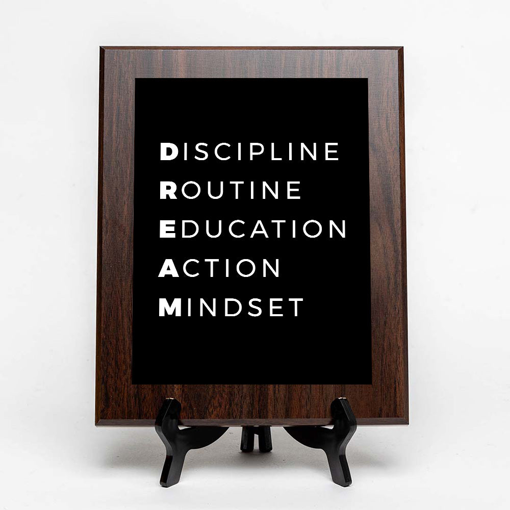 Elevate your space with our DREAM decorative wall plaque. Crafted with precision, each plaque features a solid Walnut finish wood base with a sleek aluminum plate, carrying a range of stylish and contemporary designs. Choose from three sizes - 7x5", 10x8", or 9x12" - and a stylish natural or black wood base. For easy installation, each plaque is equipped with pre-cut keyhole slots on the reverse side. Mount it securely on your wall or display it on a stylish acrylic easel for added versatility. Our commitment to quality extends to ensuring your plaque arrives in pristine condition. Each piece is carefully shrink-wrapped and protected with bubble wrap during transit, so you receive it exactly as envisioned. Transform your surroundings and make a lasting impression with these beautifully crafted pieces. It's more than decor; it's a reflection of your taste and a tribute to enduring elegance.