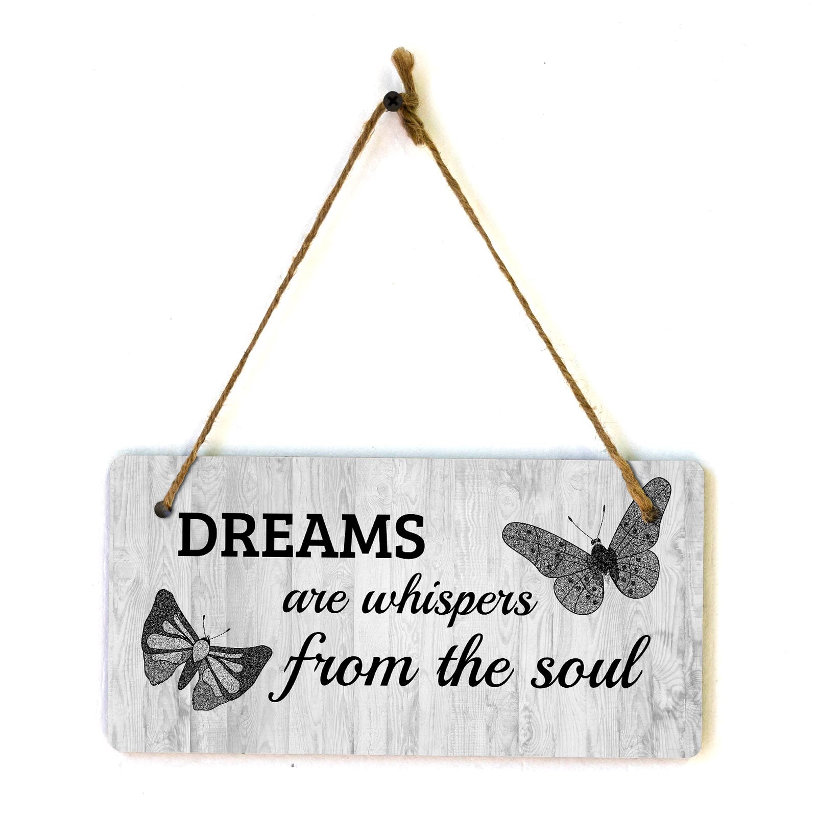 Introducing our versatile and stylish Dreams Are Whispers From The Soul, the perfect blend of style and sophistication to elevate your home or workplace. Our 5x10 Hanging Sign range is the perfect choice for your home, workplace or business. Each sign is attached with rustic twine, providing a charming and versatile accent for any space. Our curated designs effortlessly complement a variety of styles, from rustic farmhouse or Modern Chic, to simple and functional options. Choose from our diverse range of designs to personalize your space. Whether it's a warm welcome at the entrance, a motivational quote for your workspace, or a playful touch for the kids' room, our Hanging Wall or Door Signs are the perfect way to express your unique style.