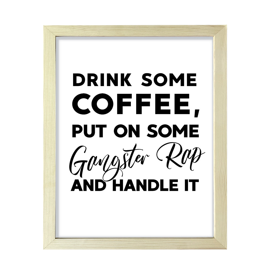 Drink some coffee, put on some gangster rap and handle it FRAMED PRINT. Our wall art is available either as a 5" x 7", 8" x 10" or 11" x 14". Printed on 160 GSM high quality card. Comes with a choice of Black, Light Brown or White colored frames. Easy to hang on any wall. This fun novelty wall art is great for your home, office, workspace, bathroom or kitchen decor.