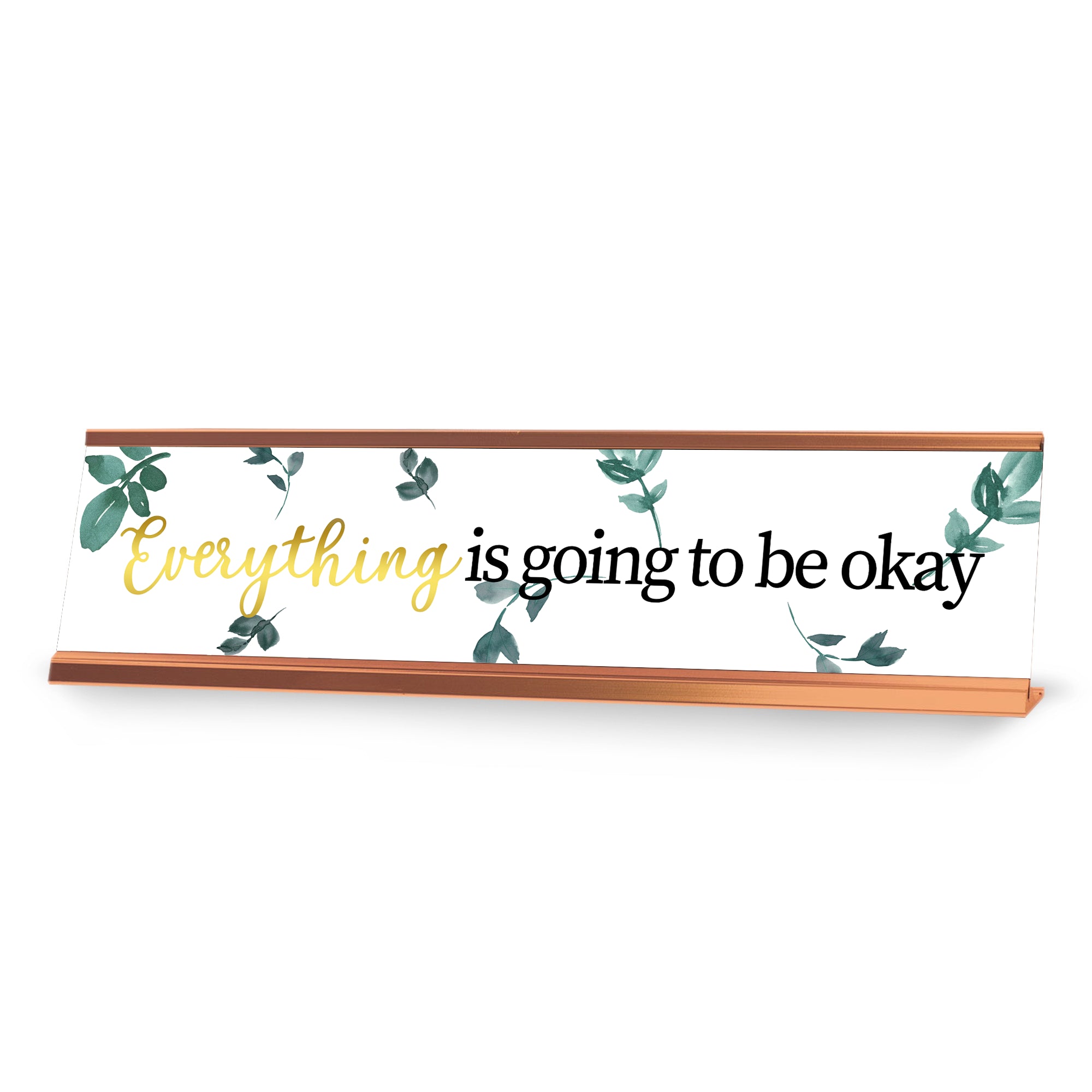 Novelty Desk Sign Nameplate "Everything is going to be okay". Fun novelty desk sign gift idea for friends, family colleagues, bosses, managers and more. The premium sublimated plastic nameplate comes with a sturdy colored alumium frame. Easily change out your nameplate with other 2 x 8" signs. Great office or desk sign for cheering up customers and staff .