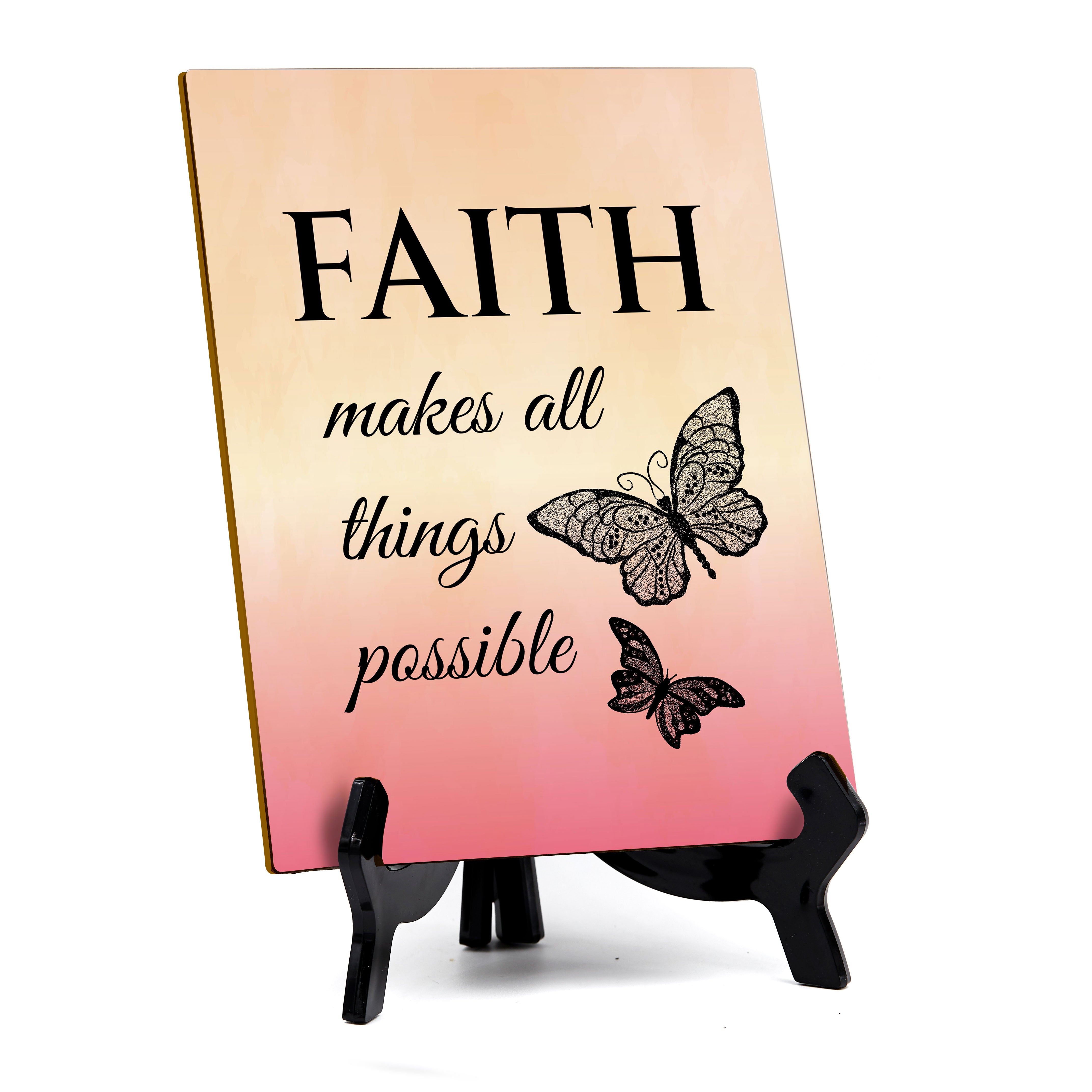 Faith Makes All Things Possible, 6X8 Table Sign. This table sign comes with it's own black acrylic easel, easy to set up and display on any flat surface.