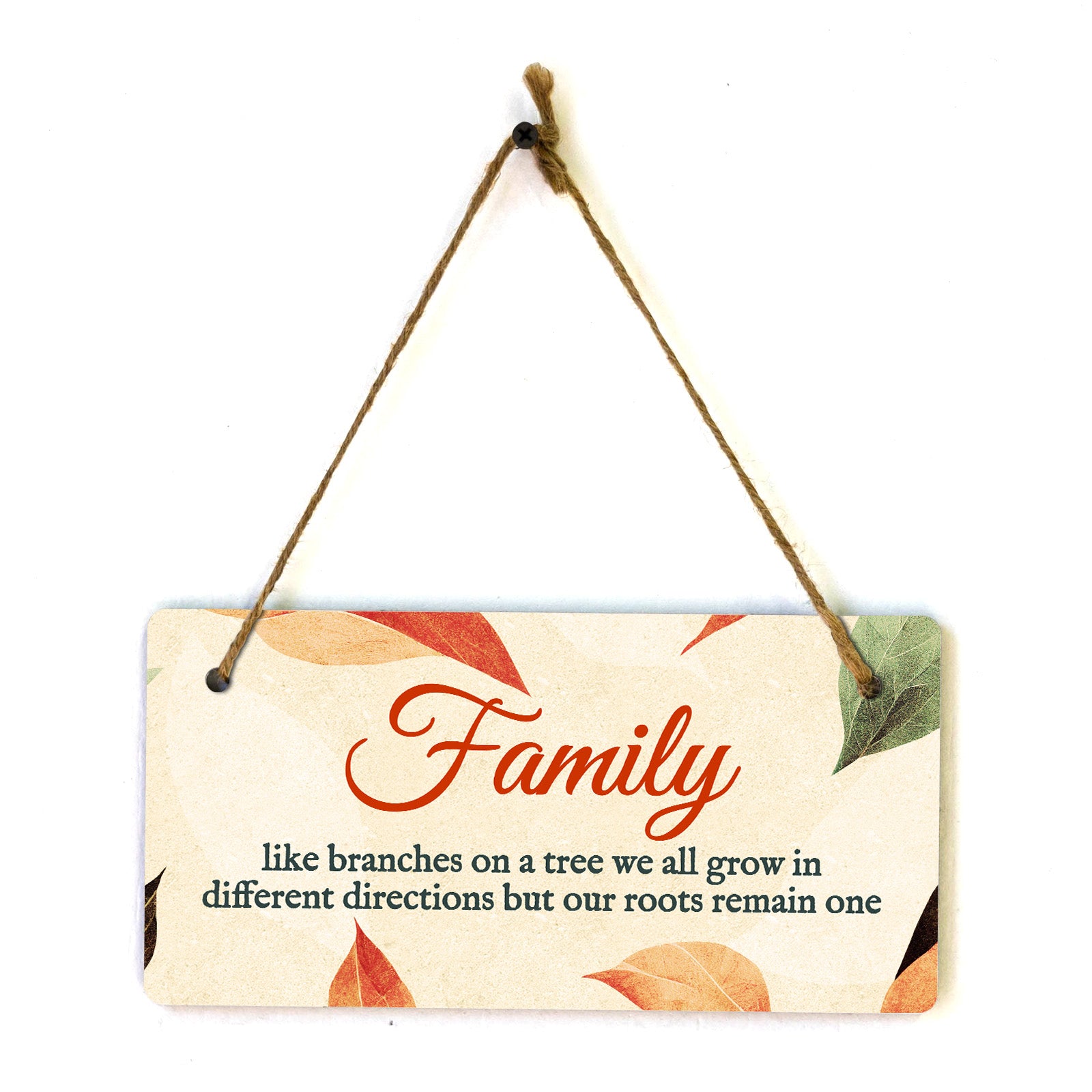 Introducing our versatile and stylish Family Like Branches On A Tree, We All Grow In Different Directions But Our Roots Remain One, the perfect blend of style and sophistication to elevate your home or workplace. Our 5x10 Hanging Sign range is the perfect choice for your home, workplace or business. Each sign is attached with rustic twine, providing a charming and versatile accent for any space. Our curated designs effortlessly complement a variety of styles, from rustic farmhouse or Modern Chic, to simple and functional options. Choose from our diverse range of designs to personalize your space. Whether it's a warm welcome at the entrance, a motivational quote for your workspace, or a playful touch for the kids' room, our Hanging Wall or Door Signs are the perfect way to express your unique style.