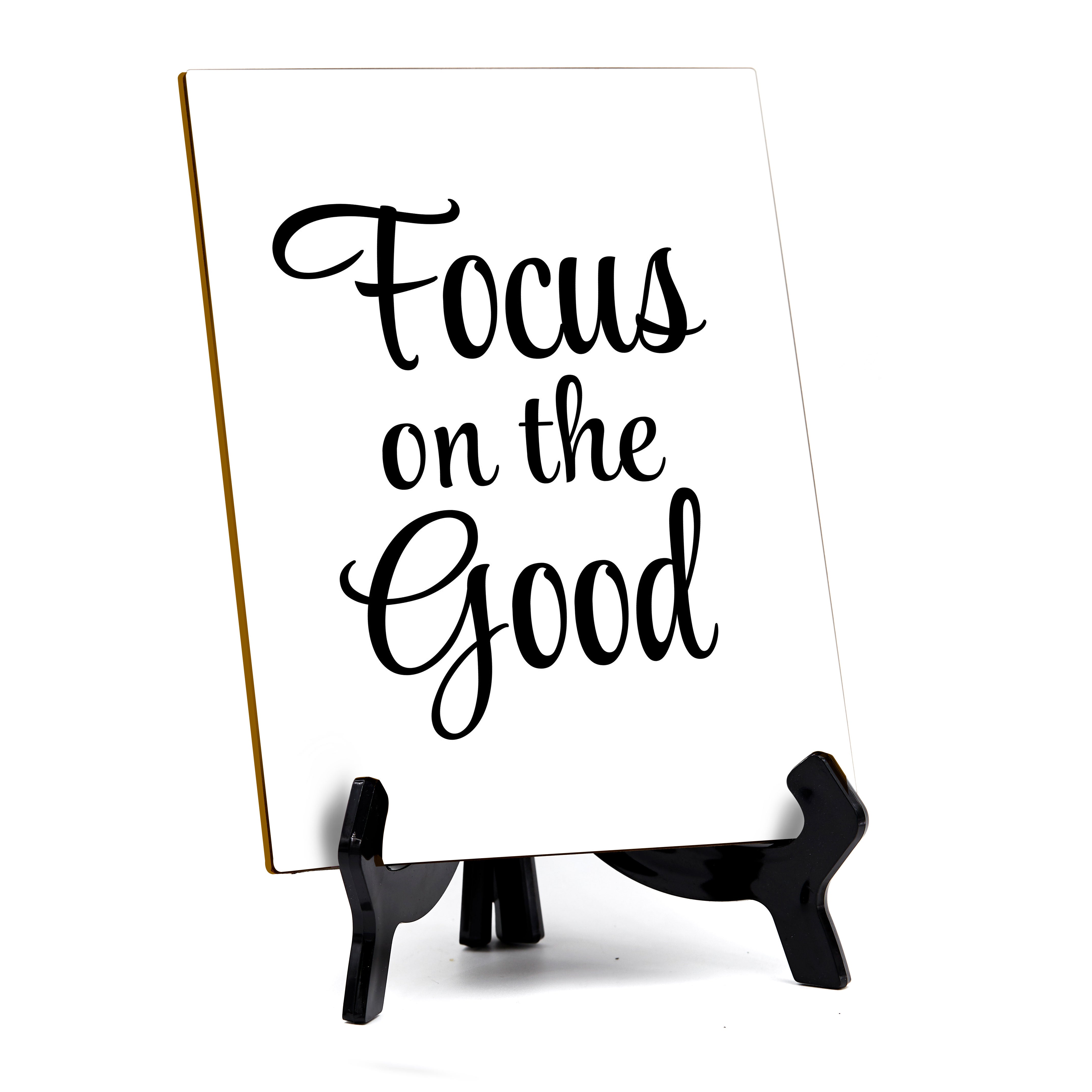 Focus On The Good, 6X8 Table Sign. This table sign comes with it's own black acrylic easel, easy to set up and display on any flat surface. Elevate the ambiance of any space with our Motivational Table Sign, designed to inspire and uplift with its powerful messages. Measuring 6 x 8 inches, this sleek and stylish sign is the perfect addition to your desk, table, or shelf. Crafted from premium materials, it boasts durability and longevity, ensuring that its motivational quotes continue to inspire for years to come. Featuring an elegant black easel stand, this sign effortlessly blends in with any decor, adding a touch of sophistication to your surroundings. Whether placed in your home, office, classroom, or any other environment, its versatility shines through, offering a source of inspiration wherever it's needed. Setting up your motivational sign is a breeze thanks to the included easel stand, allowing for quick and easy display. Whether you're seeking a daily dose of encouragement for yourself or looking for the perfect gift for a friend, family member, or coworker, our Motivational Table Sign is sure to leave a lasting impression. Let positivity and motivation fill your space with this inspiring addition to your decor.