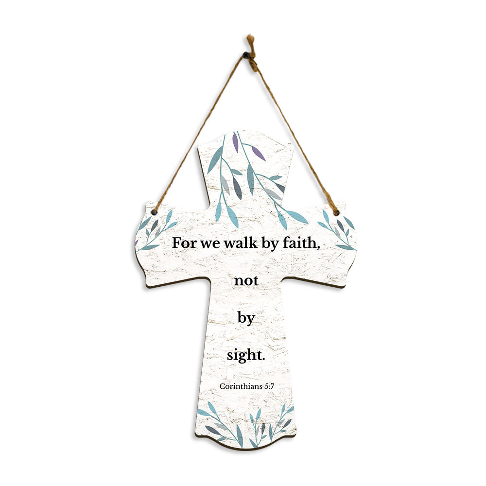 For we walk by faith, not by sight. Corinthians 5:7 11.5" x 8" Cross Hanging Sign | Rustic Twine | Inspiring Religious Bible Decor