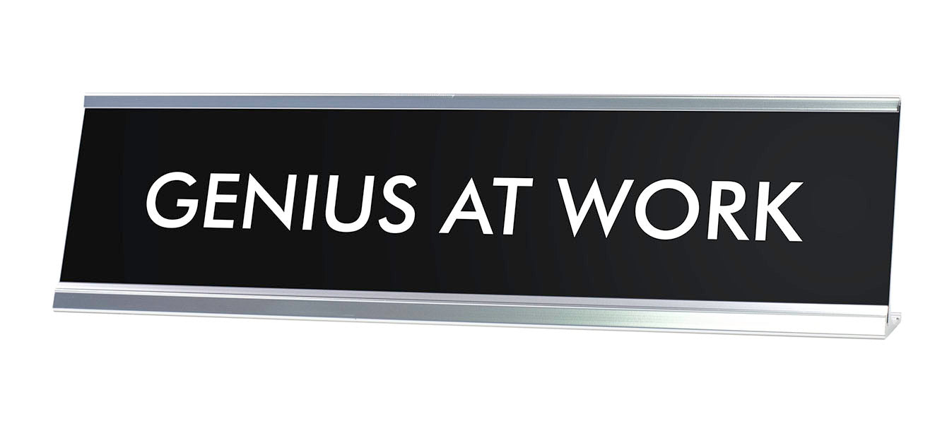 Novelty Desk Plate sign for the at home or work. The name plate is black with white lettering. Plate slides into a silver aluminum desk holder.