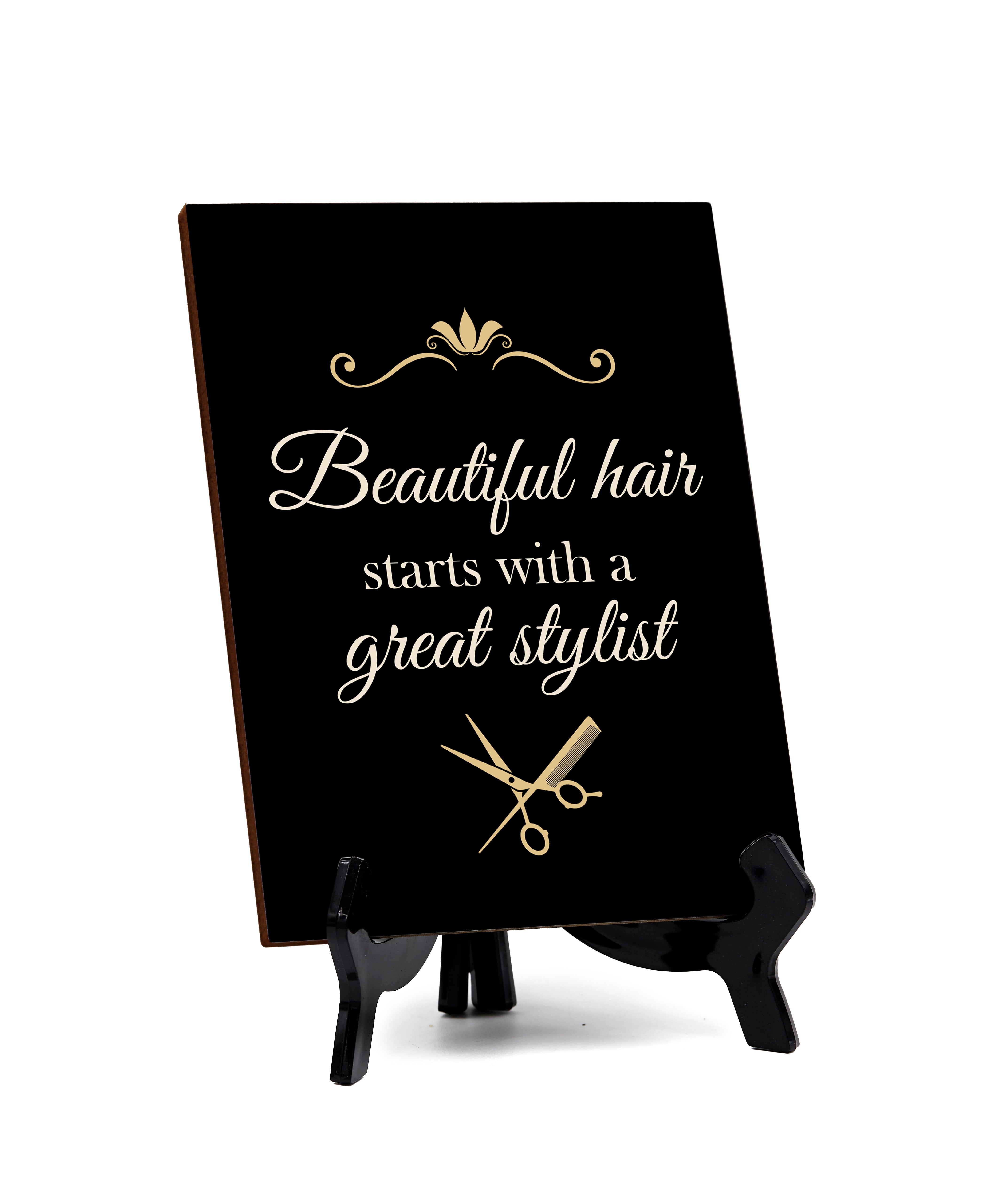 Our Signs ByLITA Hairdressers and Stylists Decoration, 6X8 Table Sign. This table sign comes with it's own black acrylic easel, easy to set up and display on any flat surface.
