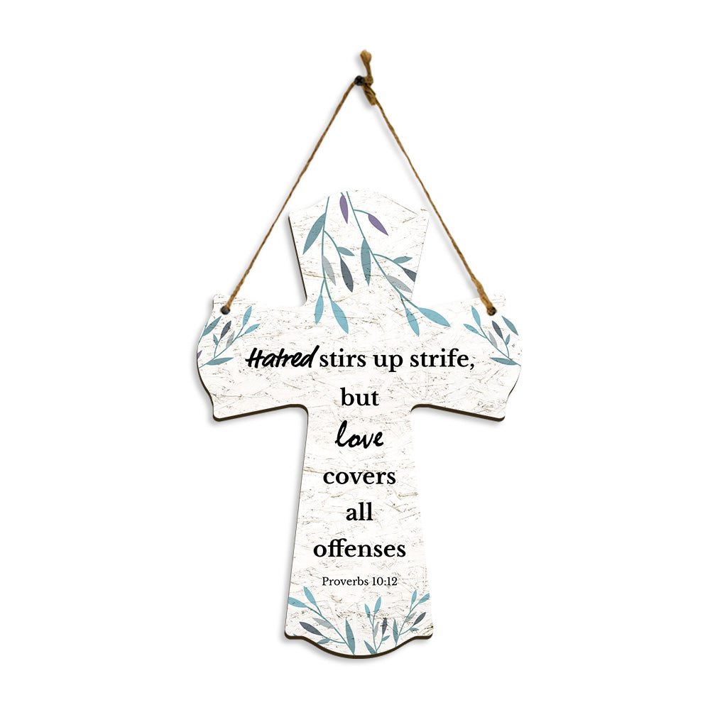 Hatred stirs up strife, but love covers all offenses Proverbs 10:12 11.5" x 8" Cross Hanging Sign | Rustic Twine | Inspiring Religious Bible Decor