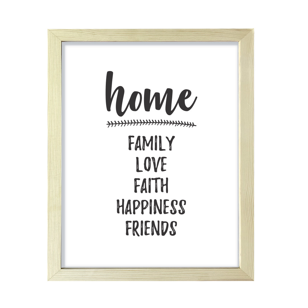 HOME Family Love Faith Happiness Friends FRAMED PRINT. Our wall art is available either as a 5" x 7", 8" x 10" or 11" x 14". Printed on 160 GSM high quality card. Comes with a choice of Black, Light Brown or White colored frames. Easy to hang on any wall. This art is great for your home, office, workspace, bathroom or kitchen decor.