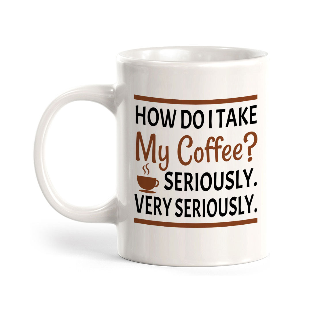 How Do I Take My Coffee? Seriously. Very Seriously. Coffee Mug. This mug is great for your home, office or workspace. Perfect gift for your friends and family, be sure to check out our other mug designs!