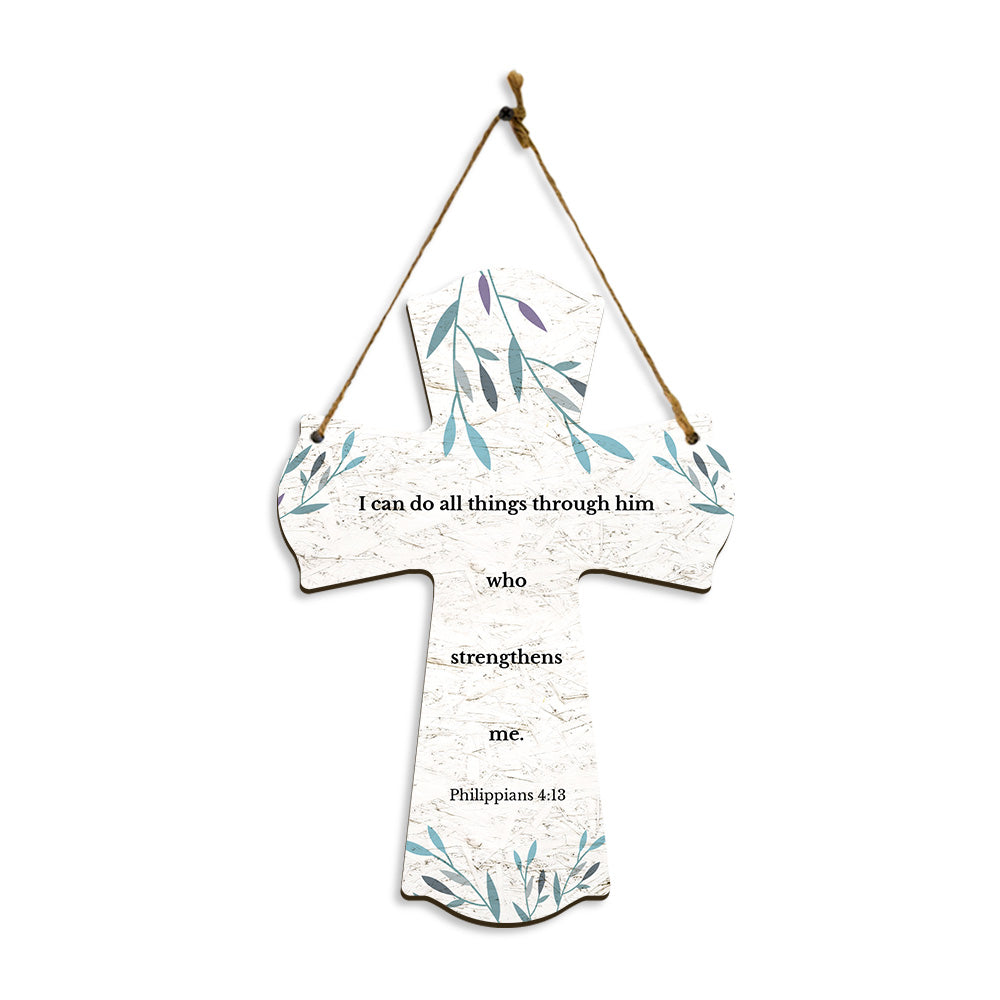 Introduce faith and elegance to any space with our I can do all things through him who strengthens me. Philippians 4:13 11.5 x 8.5-inch hanging cross sign. Crafted from wood and hung by a piece of rustic twine, this simple and stylish design suits any space. Each cross is meticulously designed by our dedicated team, featuring carefully chosen messages of worship, scripture extracts, and heartfelt dedications of faith, making it a meaningful addition to any room. Whether displayed in your home, office, or place of worship, this hanging cross sign serves as a constant reminder of faith and inspiration. It's perfect for gifting on special occasions such as baptisms, birthdays, and weddings, or as a thoughtful way to celebrate and express your faith daily. Our hanging cross signs are not just decorations; they are symbols of devotion and cherished keepsakes that bring spiritual warmth and a sense of devotion into any environment. Celebrate and share your beliefs with this elegant and inspiring hanging Cross sign, a testament to your faith and a beautiful addition to any space.