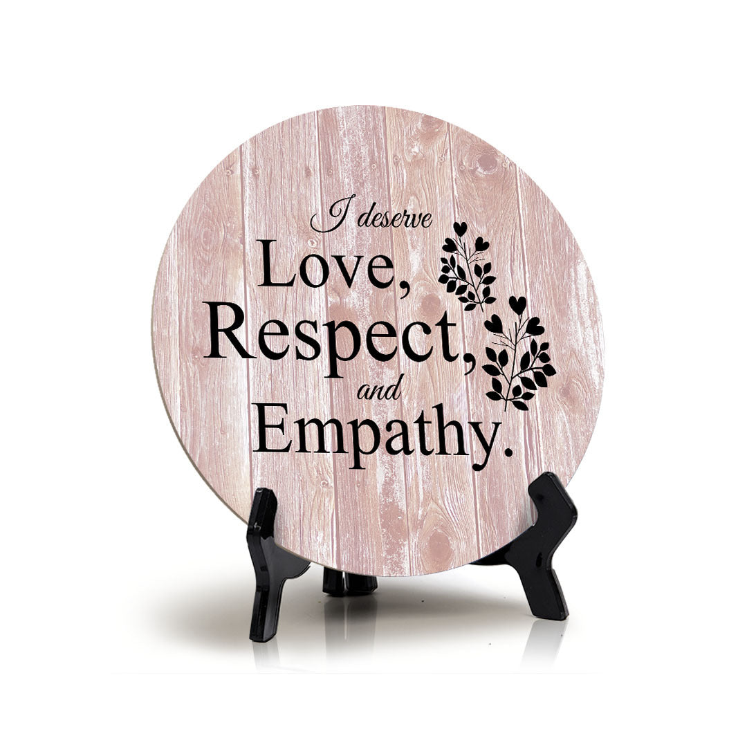 I Deserve Love, Respect And Empathy, Decorative Positive Affirmation Round Table Sign. This Round Table Sign comes with it's own black acrylic easel, easy to set up and display on any flat surface. This motivational Round Table Sign is 5" x 5" in size. It is a great small Round Table Sign to provide you or a loved one with confidence and inspiration.