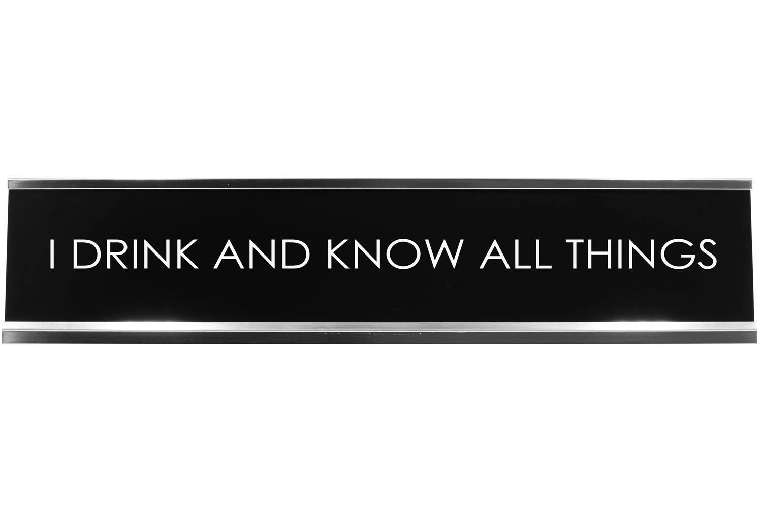 Novelty Desk Plate sign for the at home or work. The name plate is black with white lettering. Plate slides into a silver aluminum desk holder.