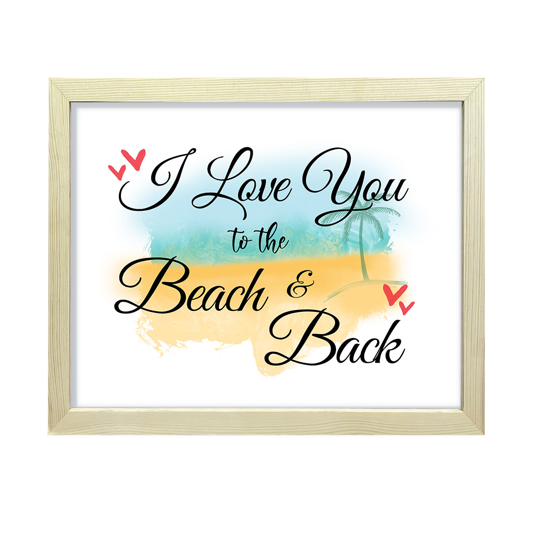 I love you to the beach and back FRAMED PRINT. Our wall art is available either as a 5" x 7", 8" x 10" or 11" x 14". Printed on 160 GSM high quality card. Comes with a choice of Black, Light Brown or White colored frames. Easy to hang on any wall. This art is great for your home, office, workspace, bathroom or kitchen decor. Cute wall art for your home for couples.