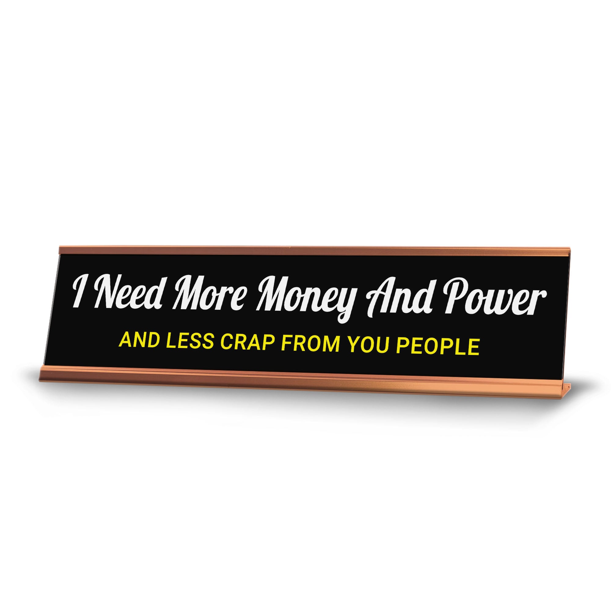 Signs ByLITA Novelty Desk Sign Nameplate "I Need More Money And Power And Less Crap From You People". Fun novelty desk sign gift idea for friends, family colleagues, bosses, managers and more. The premium sublimated plastic nameplate comes with a sturdy colored aluminium frame. Great for home or office appreciation idea for her funny desk sign.