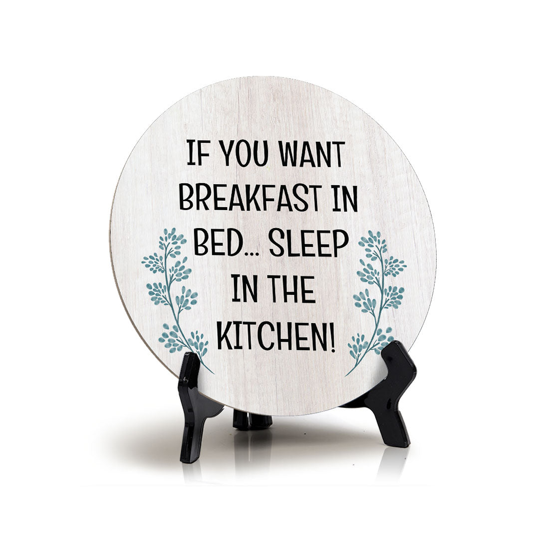 If You Want Breakfast In Bed... Sleep In The Kitchen! Circle Table Sign with Acrylic Stand (5x5") | Funny Home Decor
