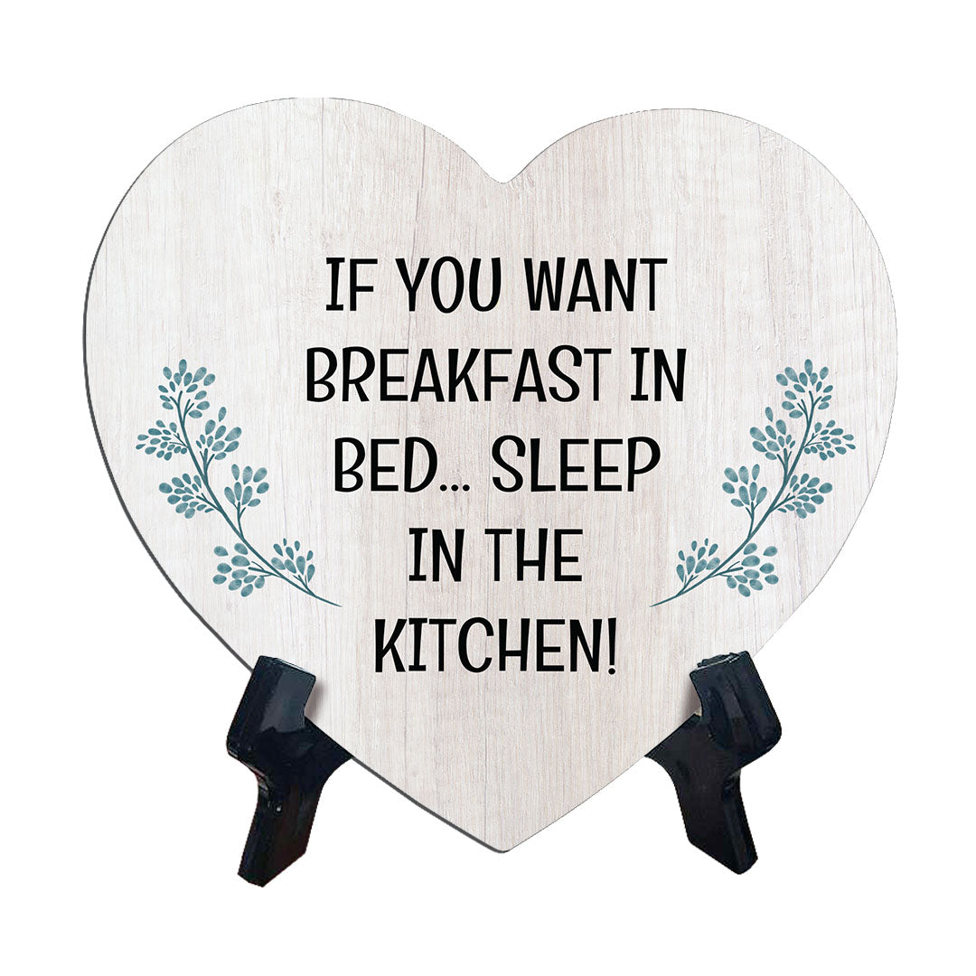 If You Want Breakfast In Bed... Sleep In The Kitchen!, 6x5 Heart Table Sign. This table sign comes with it's own black acrylic easel, easy to set up and display on any flat surface.