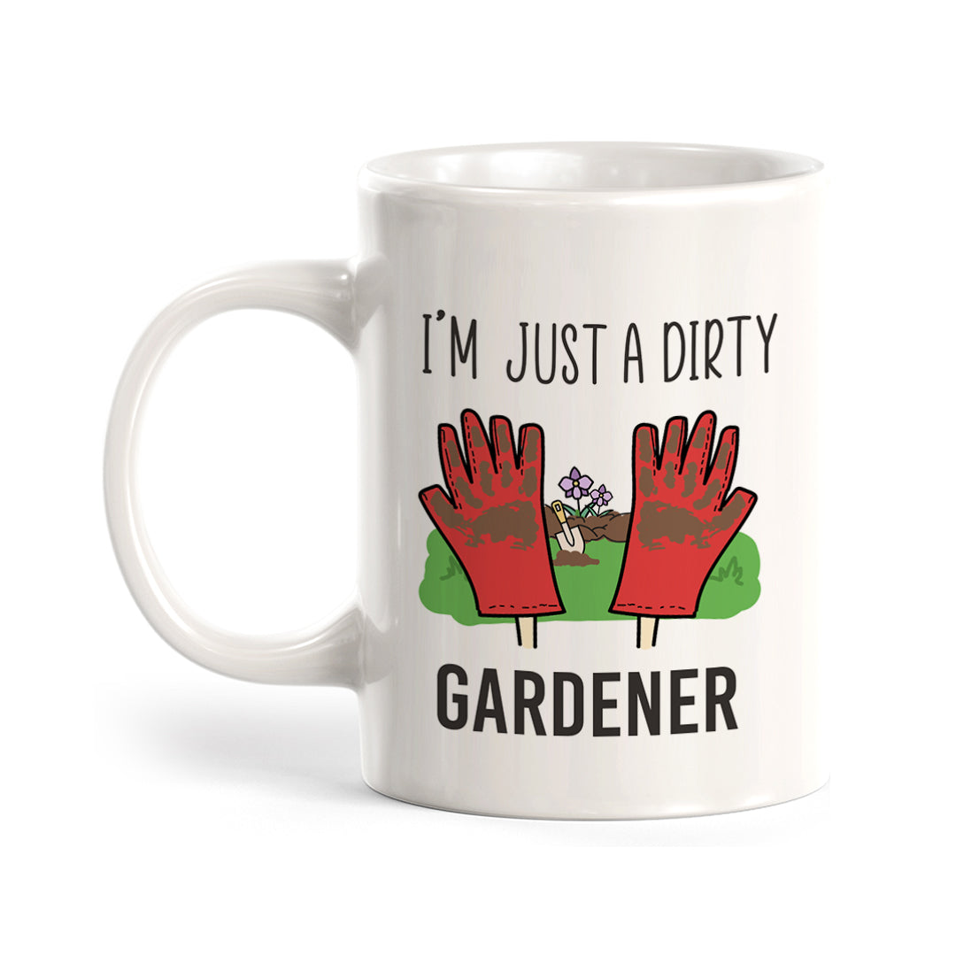 I'm just a Dirty Gardener Coffee Mug. Treat yourself or give as a gift to someone special. Our fun novelty coffee mugs are great small gifts for loved ones, colleagues, partners and friends. Great gift idea for gardeners and plant lovers. Fun, novelty coffee mug for outdoor lovers and garden enthusiasts.